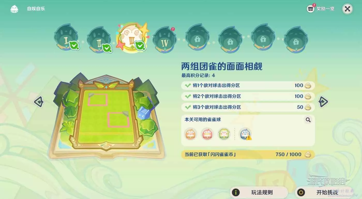 本關的重點是利用華麗雀雀球吸引周圍的我方其他雀雀球進入得分區,然後拿到目標分數。