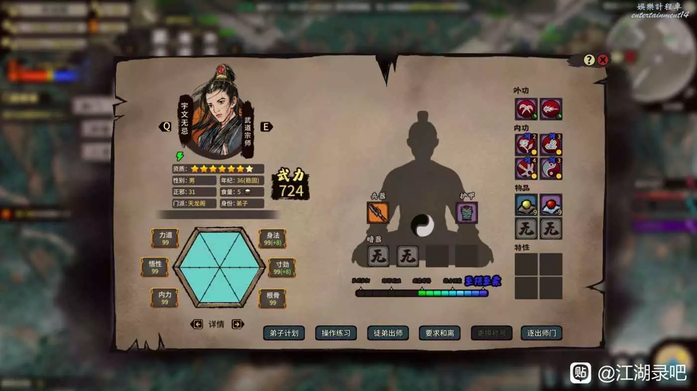 內功:太陰大法(對有負面效果的敵人造成傷害提升50%,強烈推薦,只要敵人中外傷 毒傷 火傷 凍結 中毒 失明 斷筋 減速 失衡 點穴 柔弱其一就增傷)
