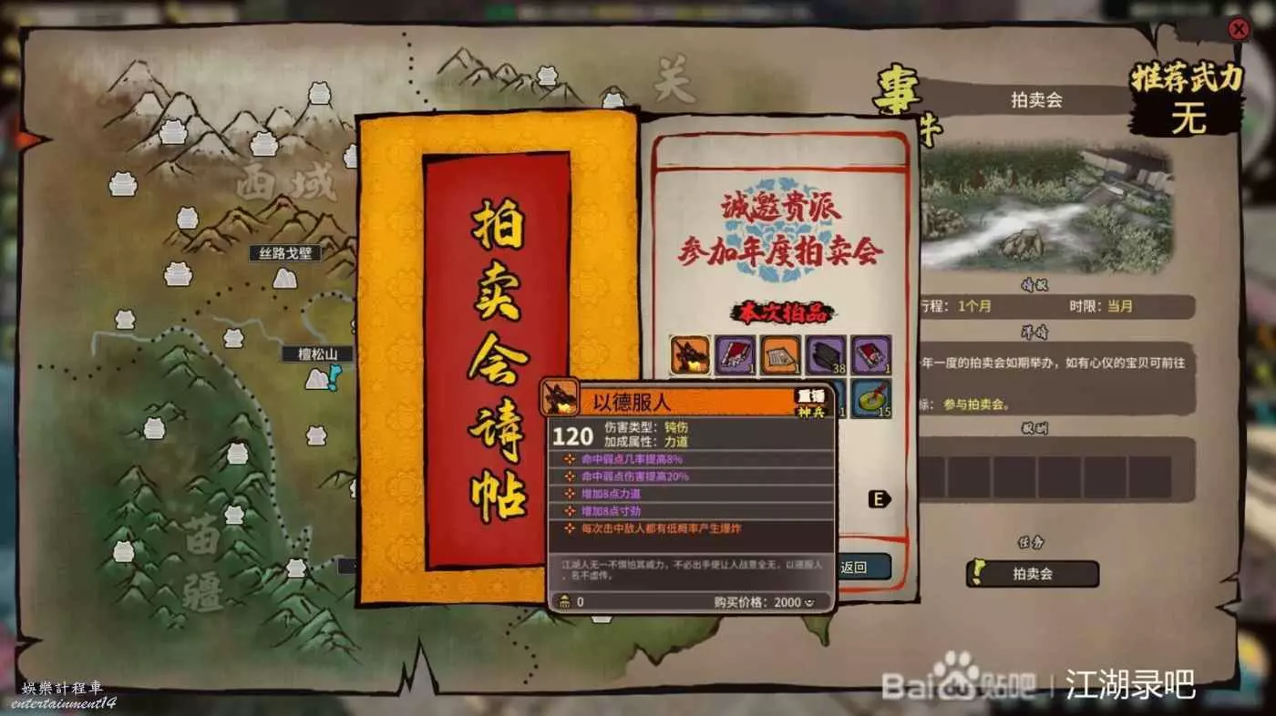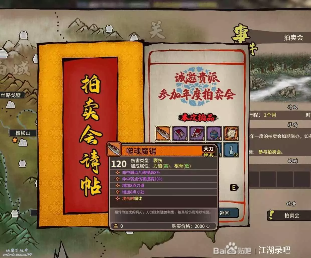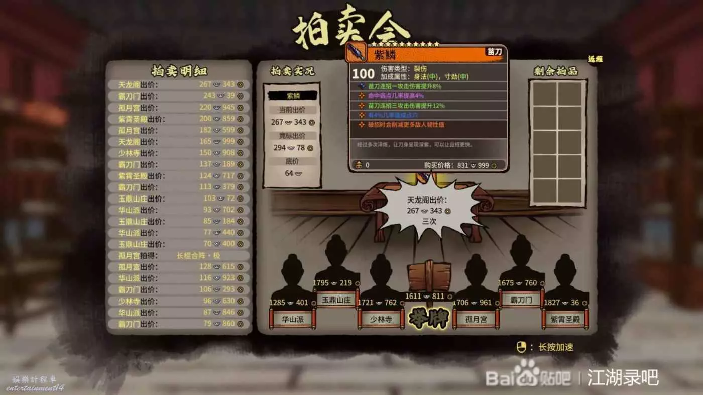 拍賣的漏主要來自10星橙武,可以200多銀兩拿下,賣的話5,600百隨便賣,如果有需要的陣法和武學,但是拍賣被起哄價格抬很高,可以等別的門派拍下後,去外交介面原價交易即可