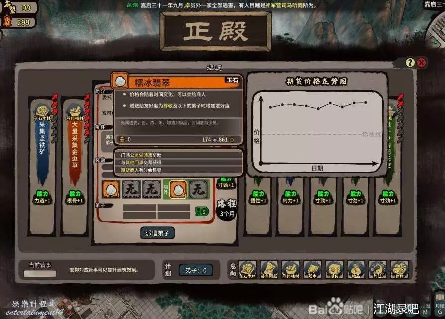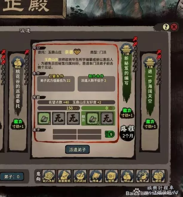 需要提示一點,如果開局非中原地區且特性沒有行程縮短的加成,有時候去個別地圖需要兩個月,會虧弟子效率,同時單個弟子行囊有限,如果有時候價格太多合適的,多點幾個弟子一起。