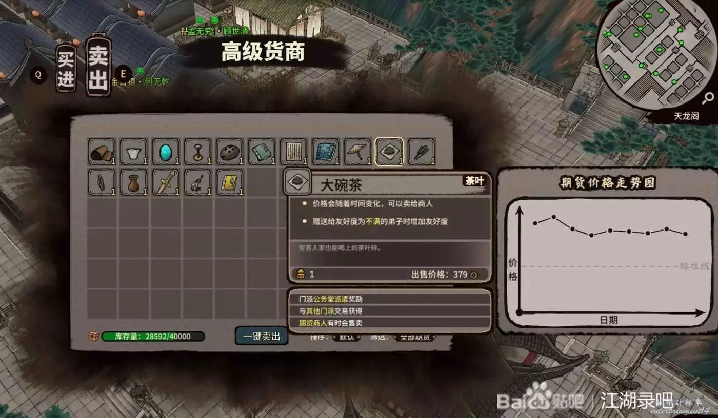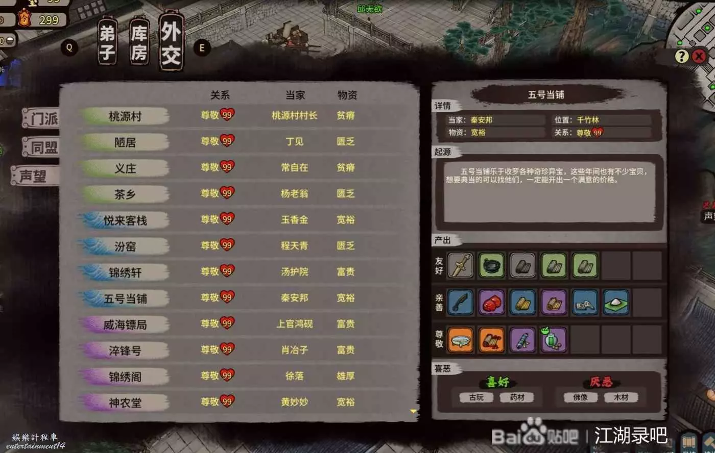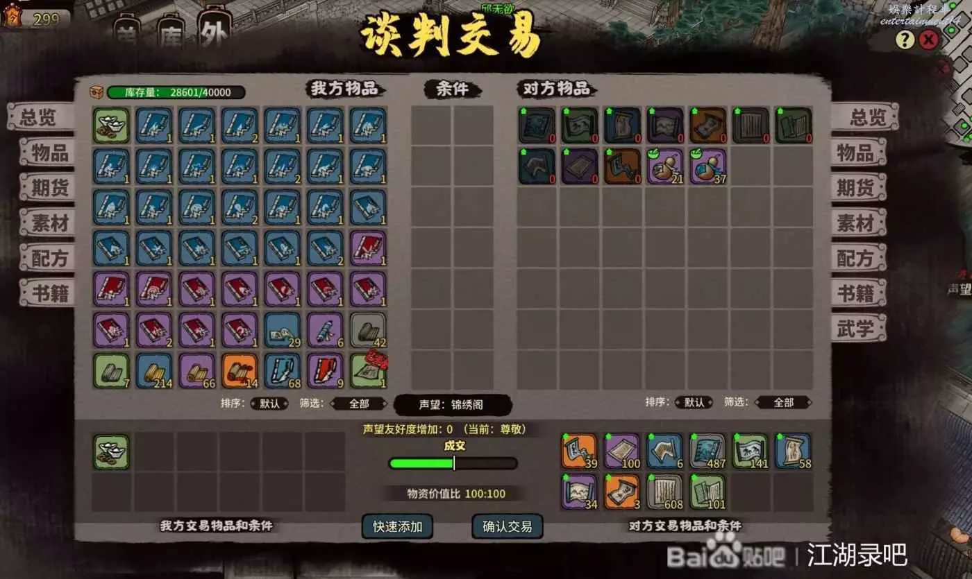 當然由於門派內一切行動不消耗回合數,我們可以點擊外交,聲望,和每個組織交易,所有商品都可交易,也不會有兩個地圖物品都大降價沒辦法抉擇遺憾選其一的事情發生了,所有物品都可以在門派內交易,也方便sl,直接選中物品,快速新增,交易即可。友好度影響價格,可通過送禮或者完成正殿派遣任務慢慢疊加,需要通過聲望的提升逐步解鎖每個組織。