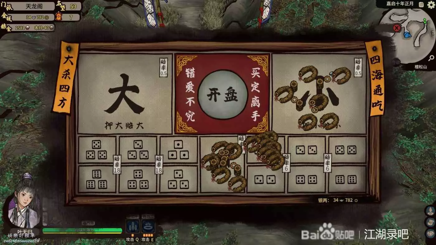 主打一個大殺四方,四海通吃, 地圖上的涼亭會有幾率刷出賭場,現在版本金錢每次最高上限50銀兩,可以同時下注多個,大小賠率0.5,順子賠率4,對子賠率6,豹子賠率18,贏了別墅靠海,輸了SL再來