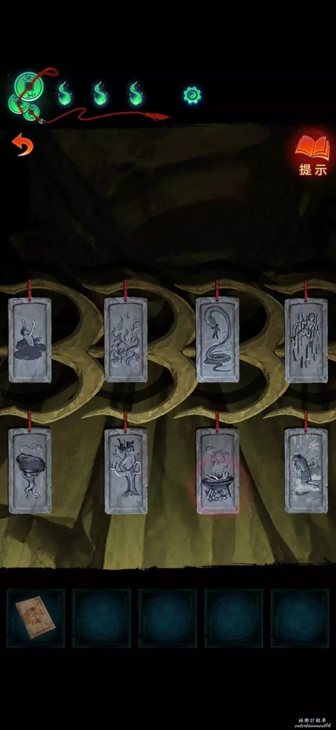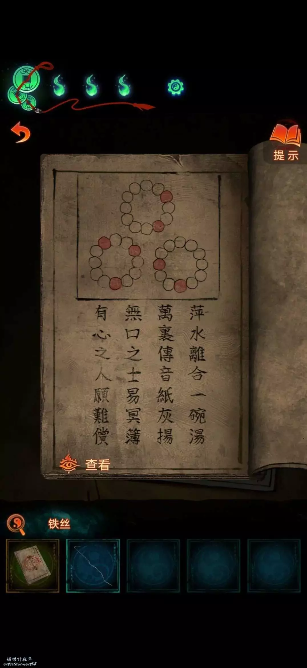 進入大門對面前雕像使用空白冥籍完成小遊戲對空白冥籍使用苦味原料,然後跟據書中線索轉動桌上手串獲得經文