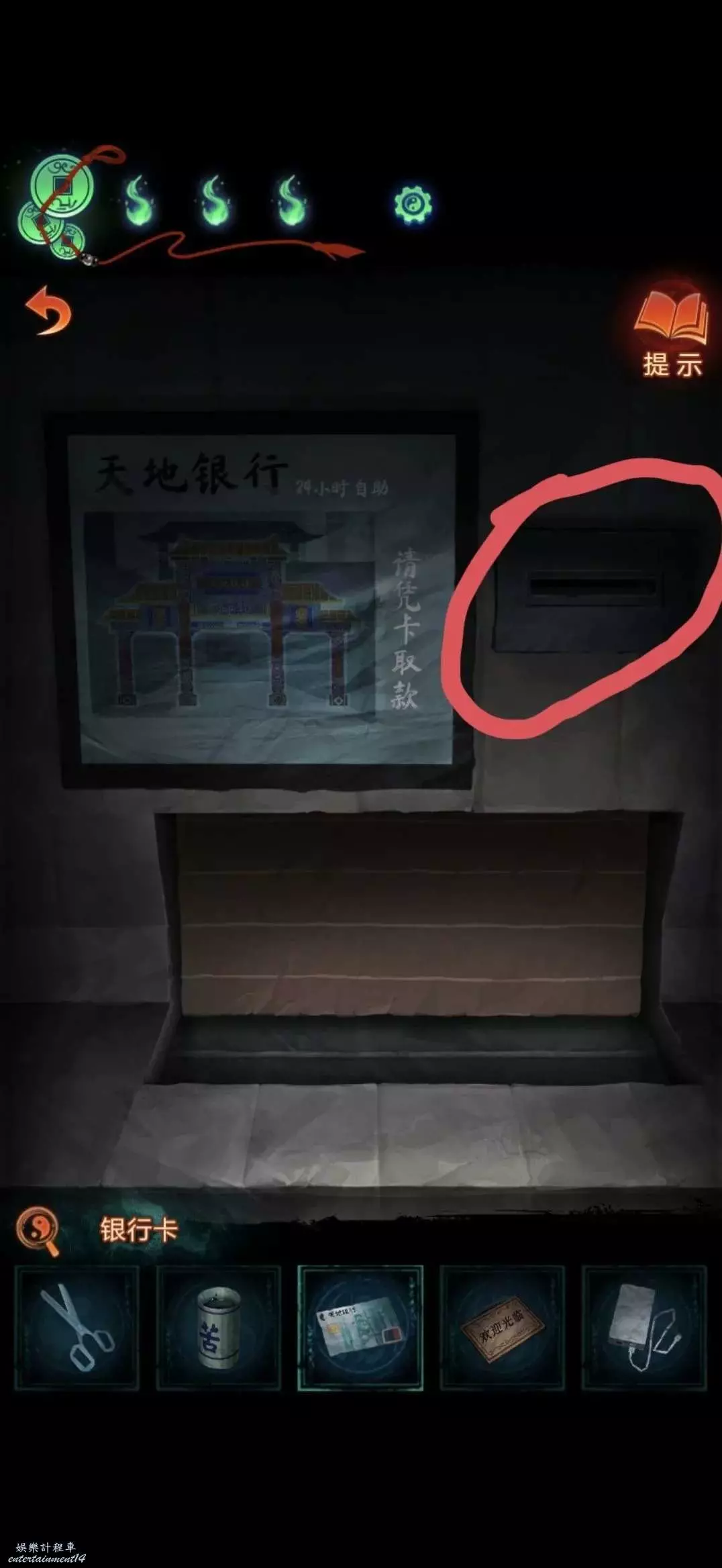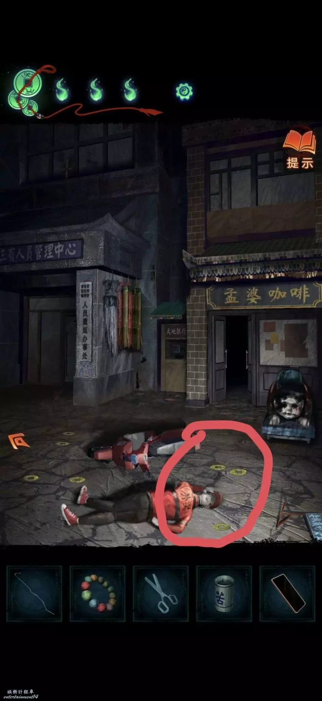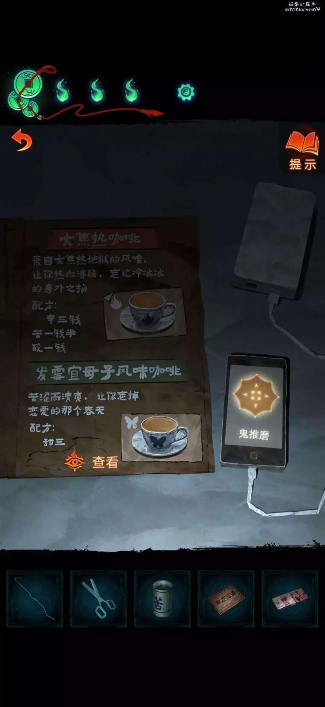 用銀行卡獲得一疊冥幣,返回咖啡店對桌上沒電手機使用充電寶獲得線索