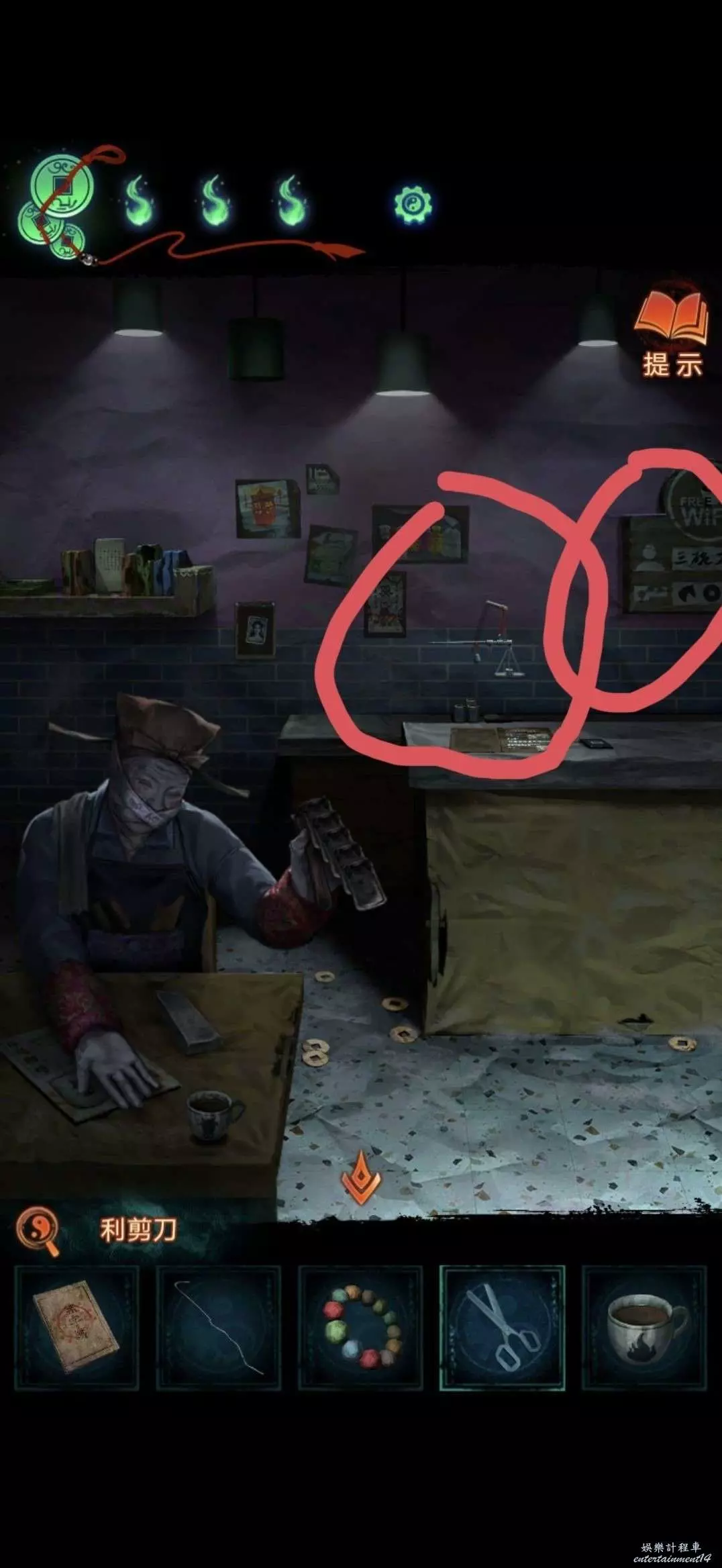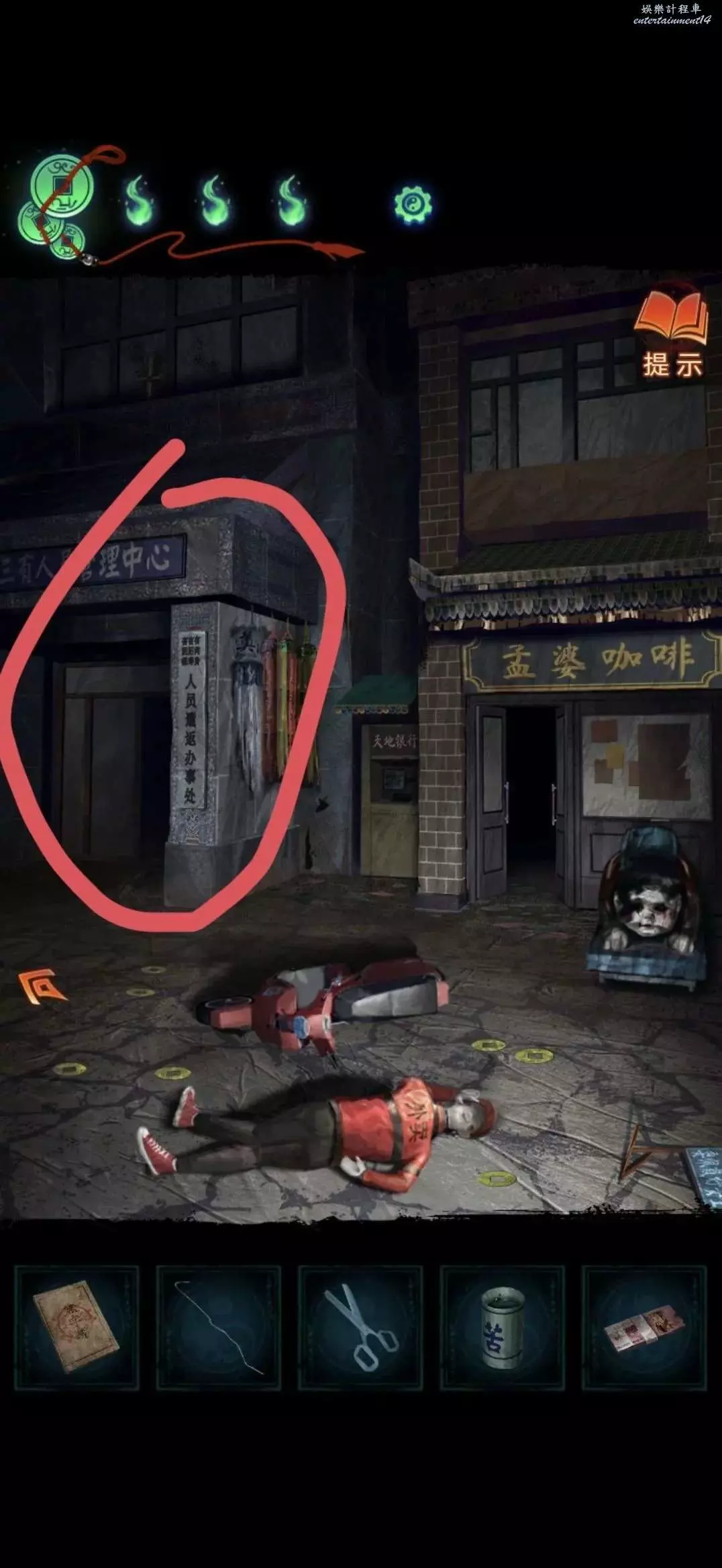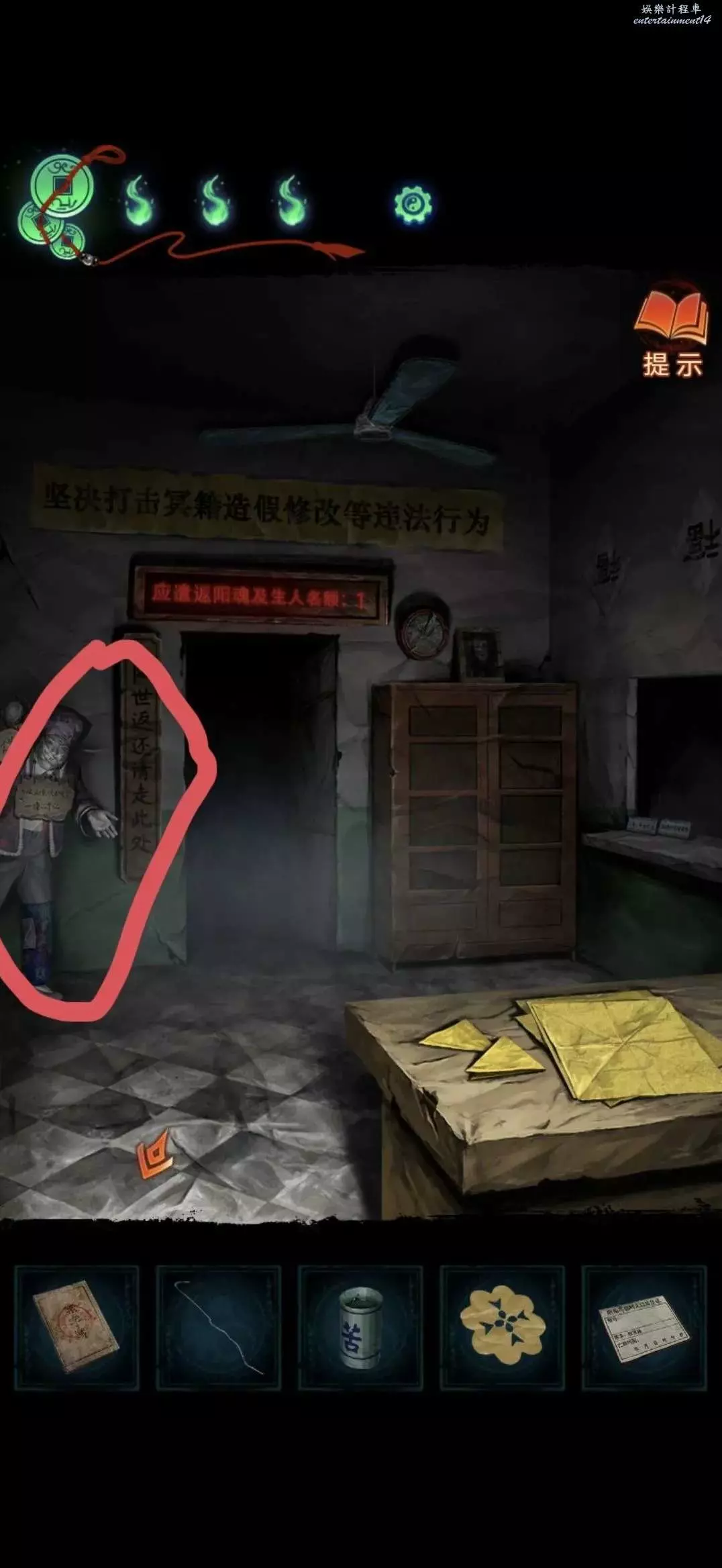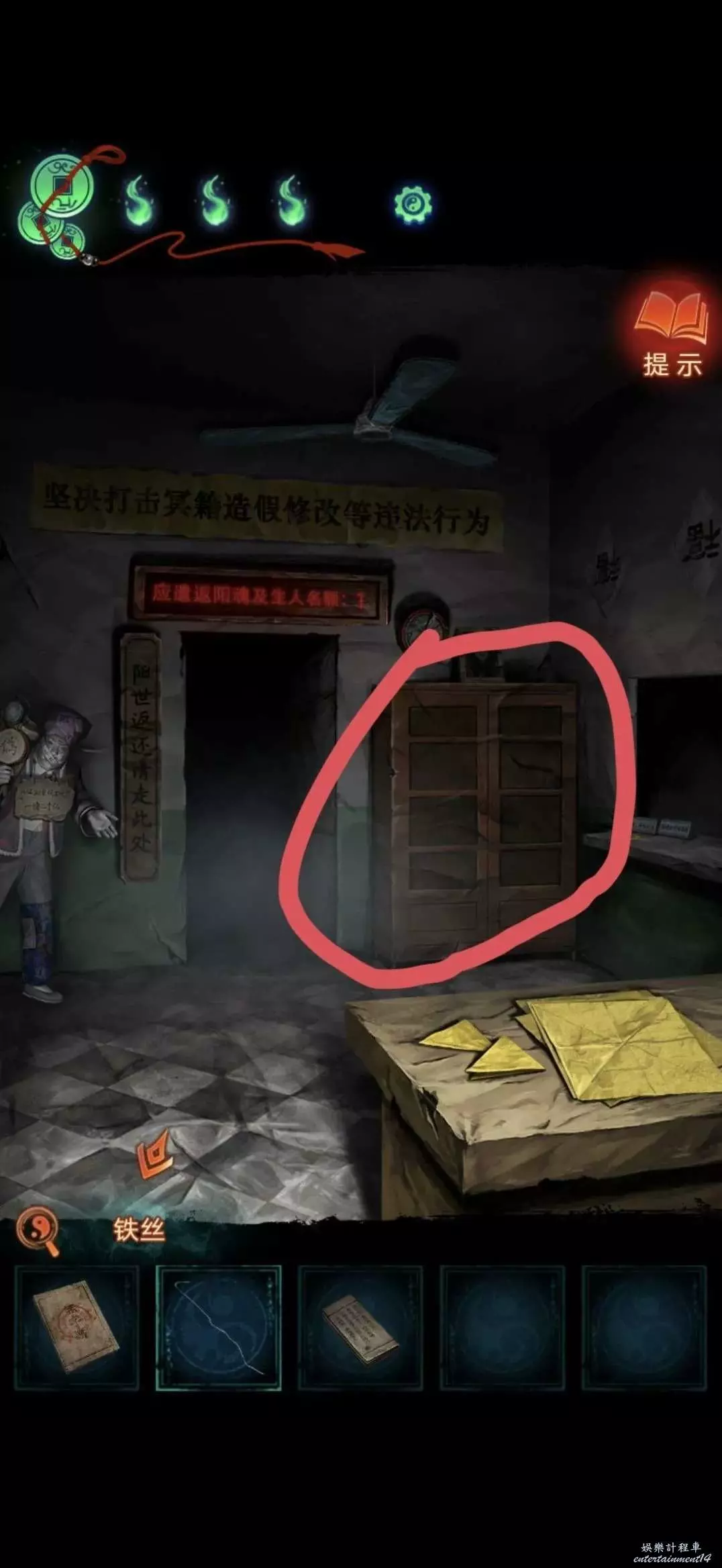 把掛牌掛在管理中心大門上,就可以進去了,進入後對點擊桌子上的黃紙使用利剪刀完成小遊戲(充電寶手機上那個線索)獲得紙錢