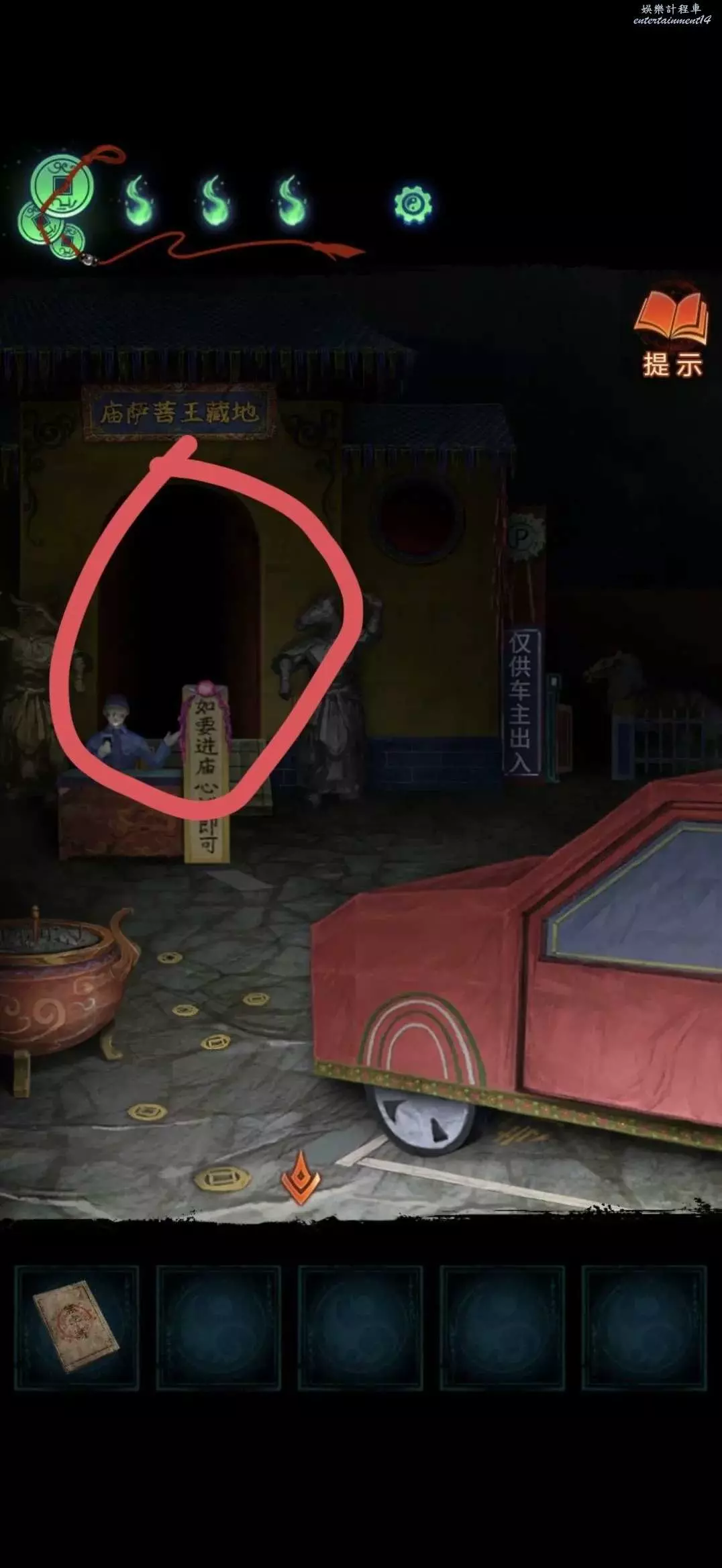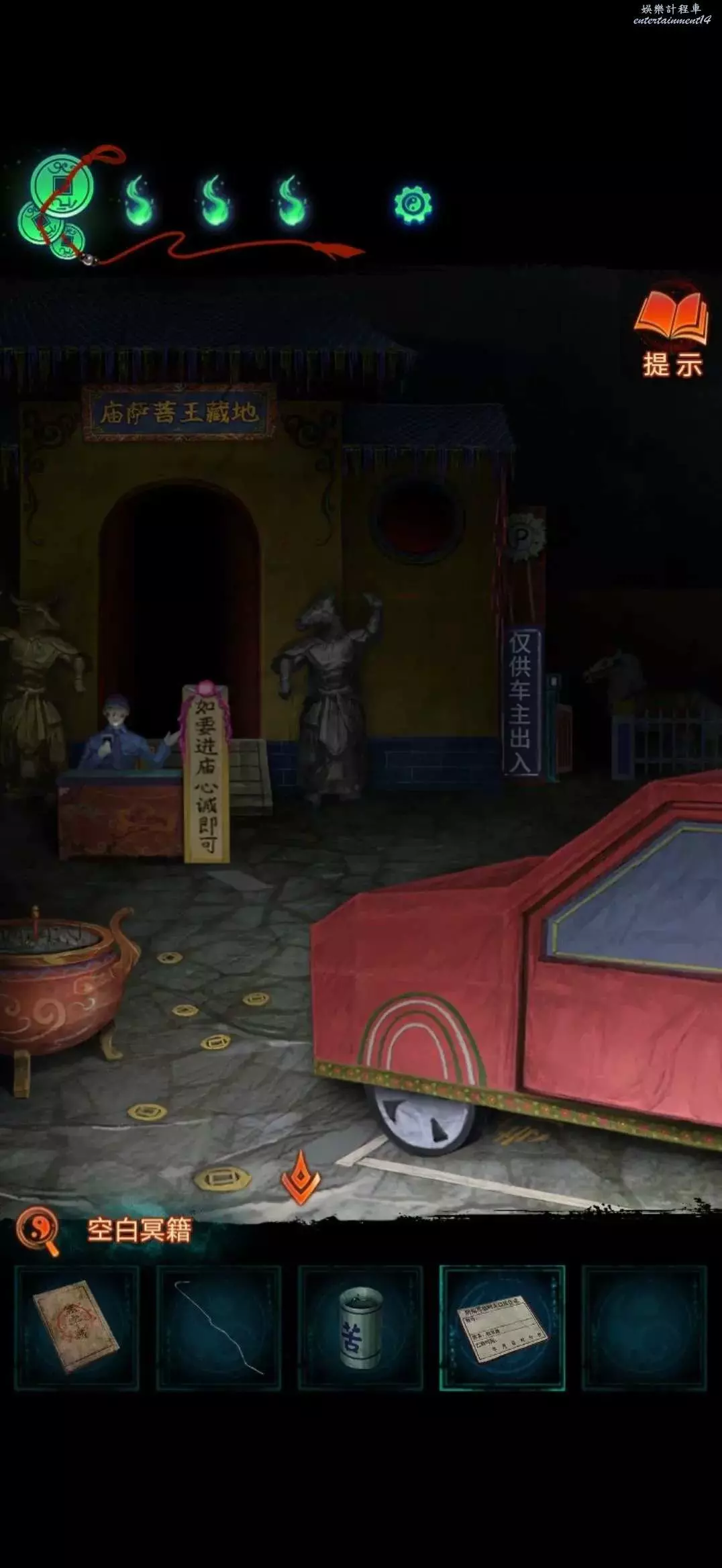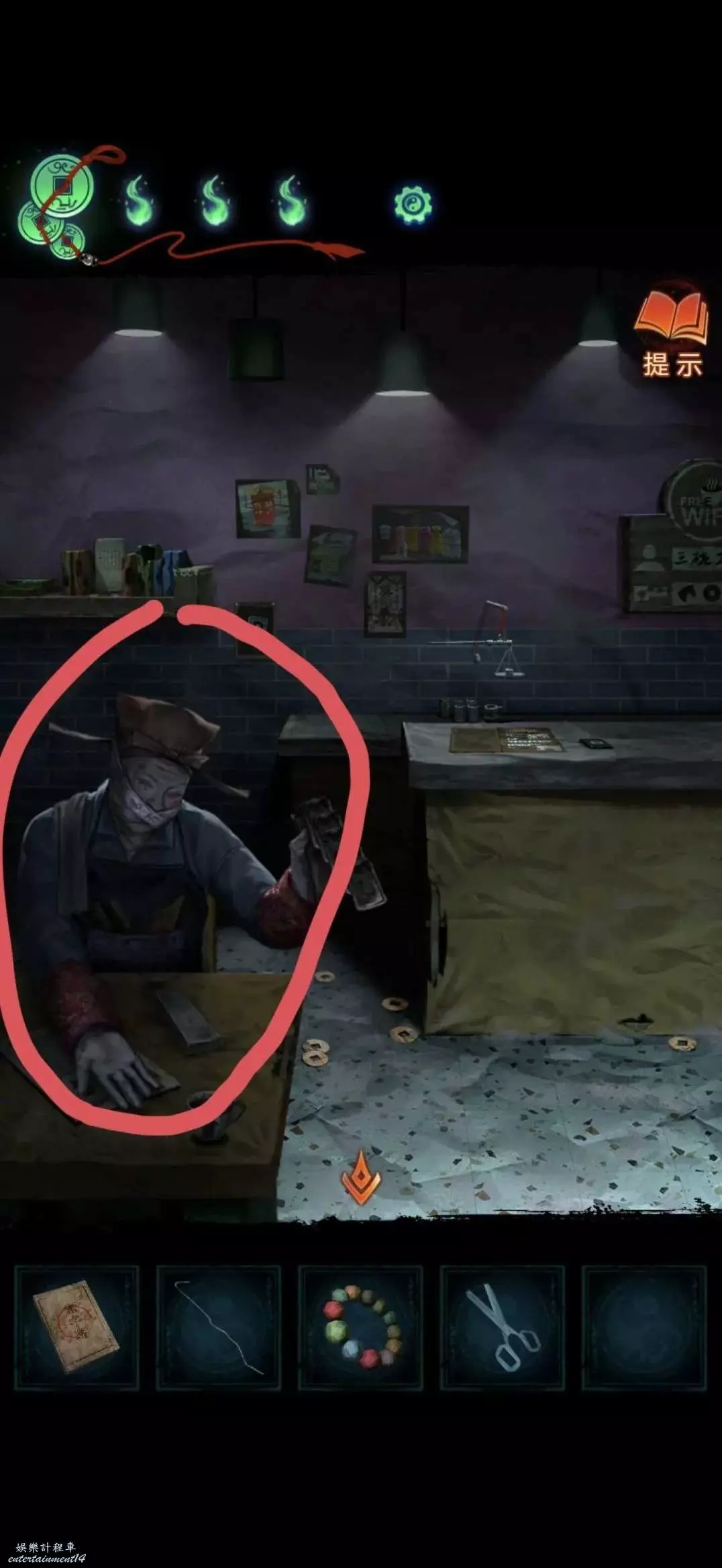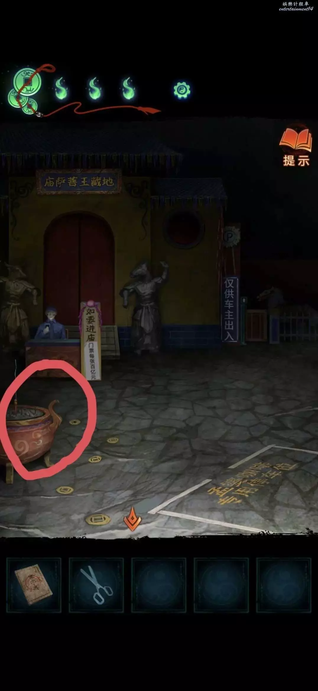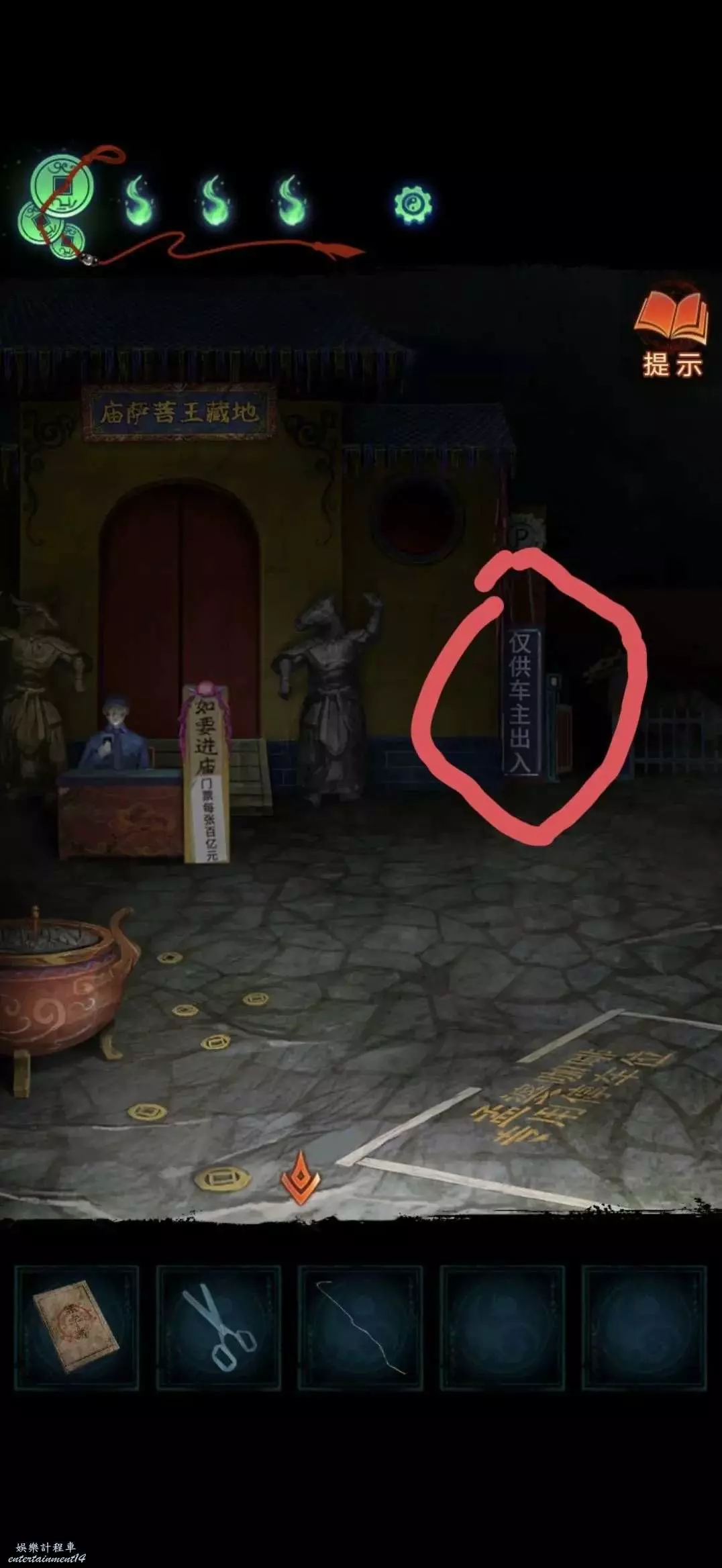 把掛牌掛在管理中心大門上,就可以進去了,進入後對點擊桌子上的黃紙使用利剪刀完成小遊戲(充電寶手機上那個線索)獲得紙錢