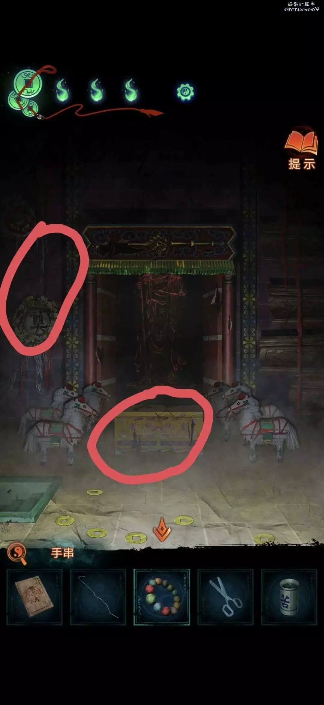 對搖搖車使用鐵絲獲得鑰匙,返回香爐的房間對停車場使用鑰匙完成小遊戲獲得手串和小物件。