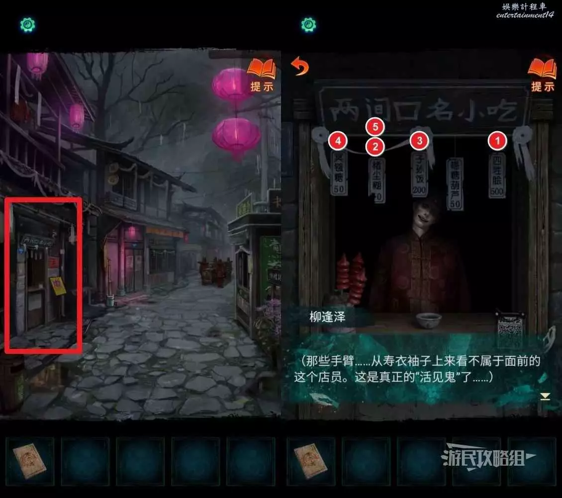 分別點擊櫃台上左右兩側的書和報紙,翻開獲得線索:男孩【節哀順變恭喜發財】;女孩【歡迎光臨一路走好】。