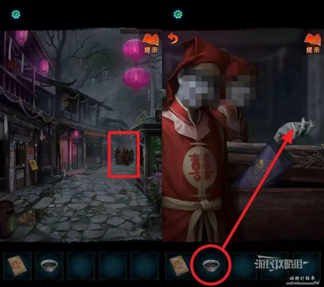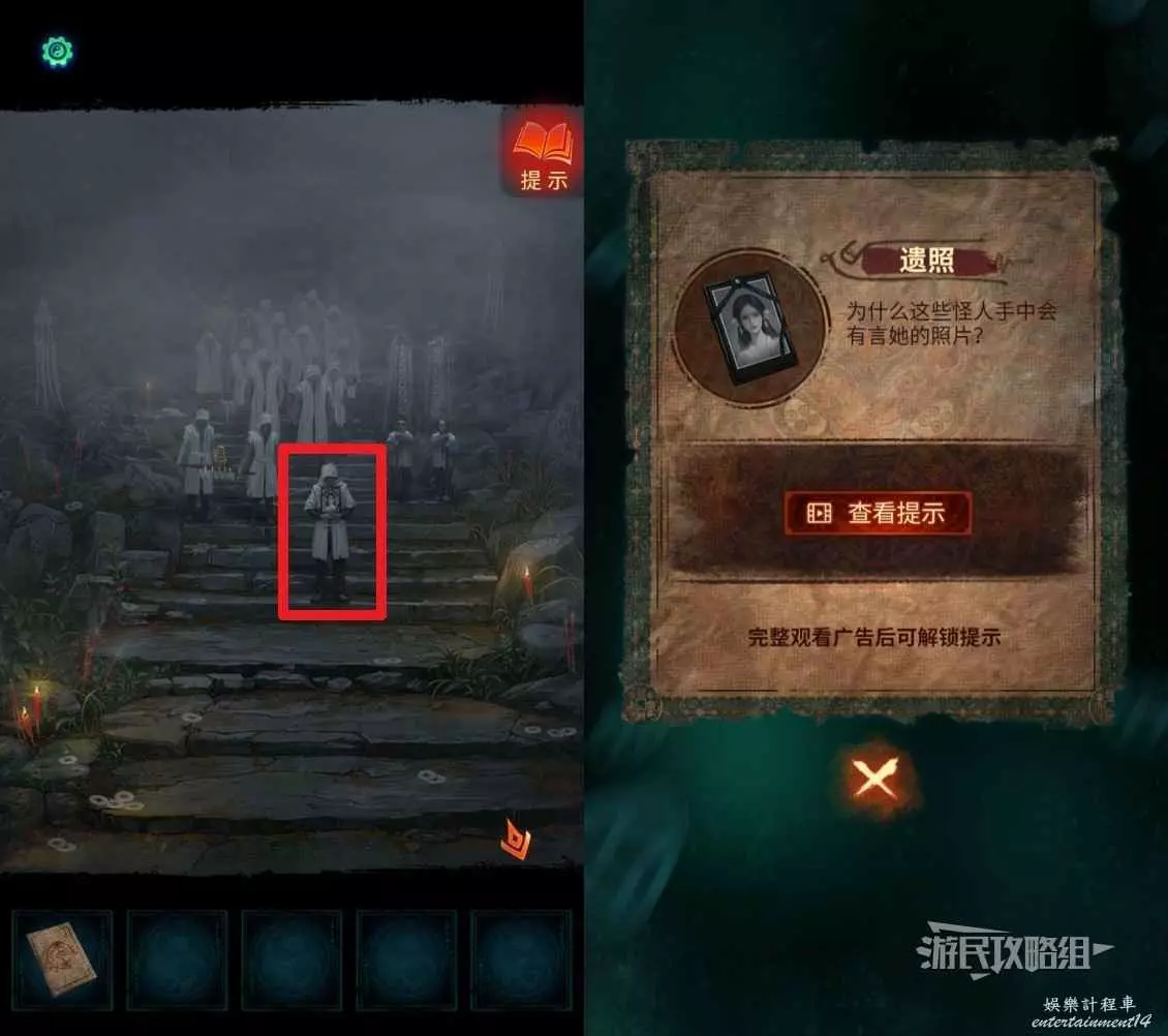 正確解謎後,喜轎移開,點擊正中間的白衣人,獲得【遺照】。