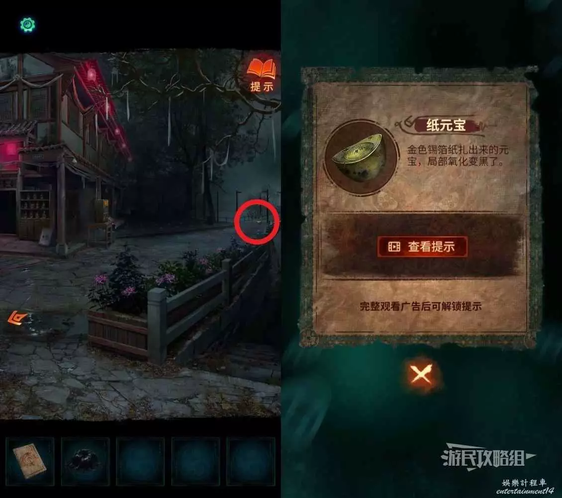 退出雕像謎題介面,發現剛才橋頭的汽車已經挪走了,點擊原來汽車所在位置獲得【紙元寶】。