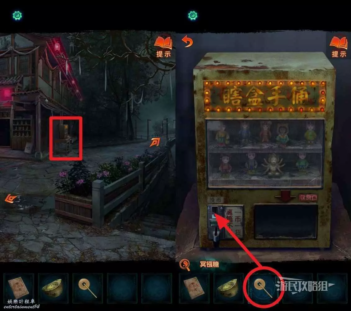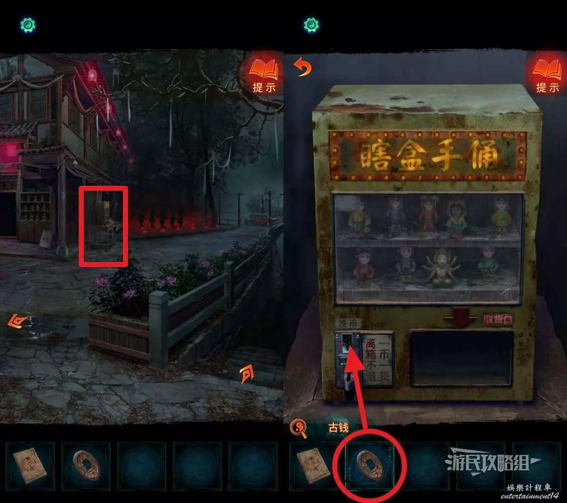 來到新區域後,點擊區域中間的盲盒機,選擇道具欄中的【古錢】,將古錢投入盲盒機器中。