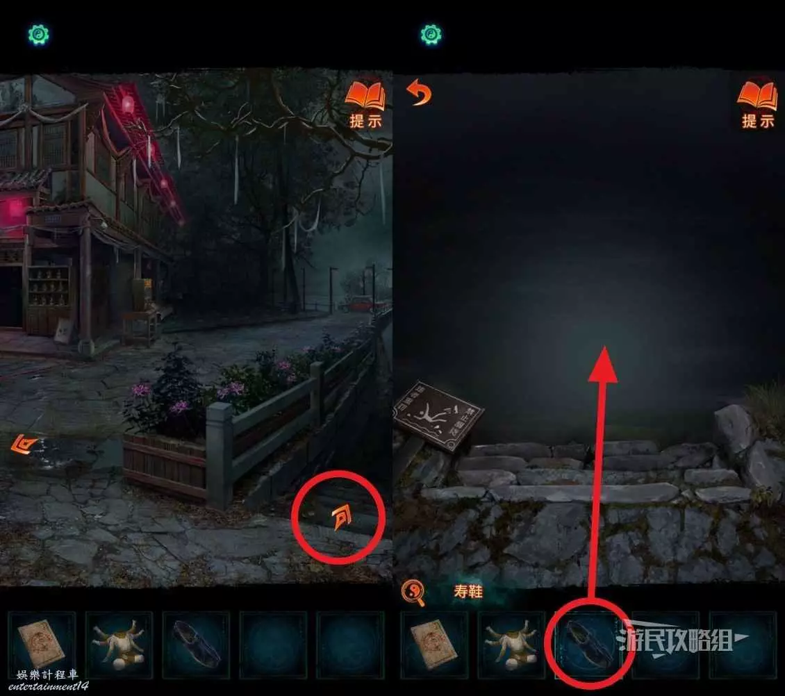 離開盲盒機,點擊右側花壇下方的樓梯到達河邊,將道具欄中的【壽鞋】放入水中。