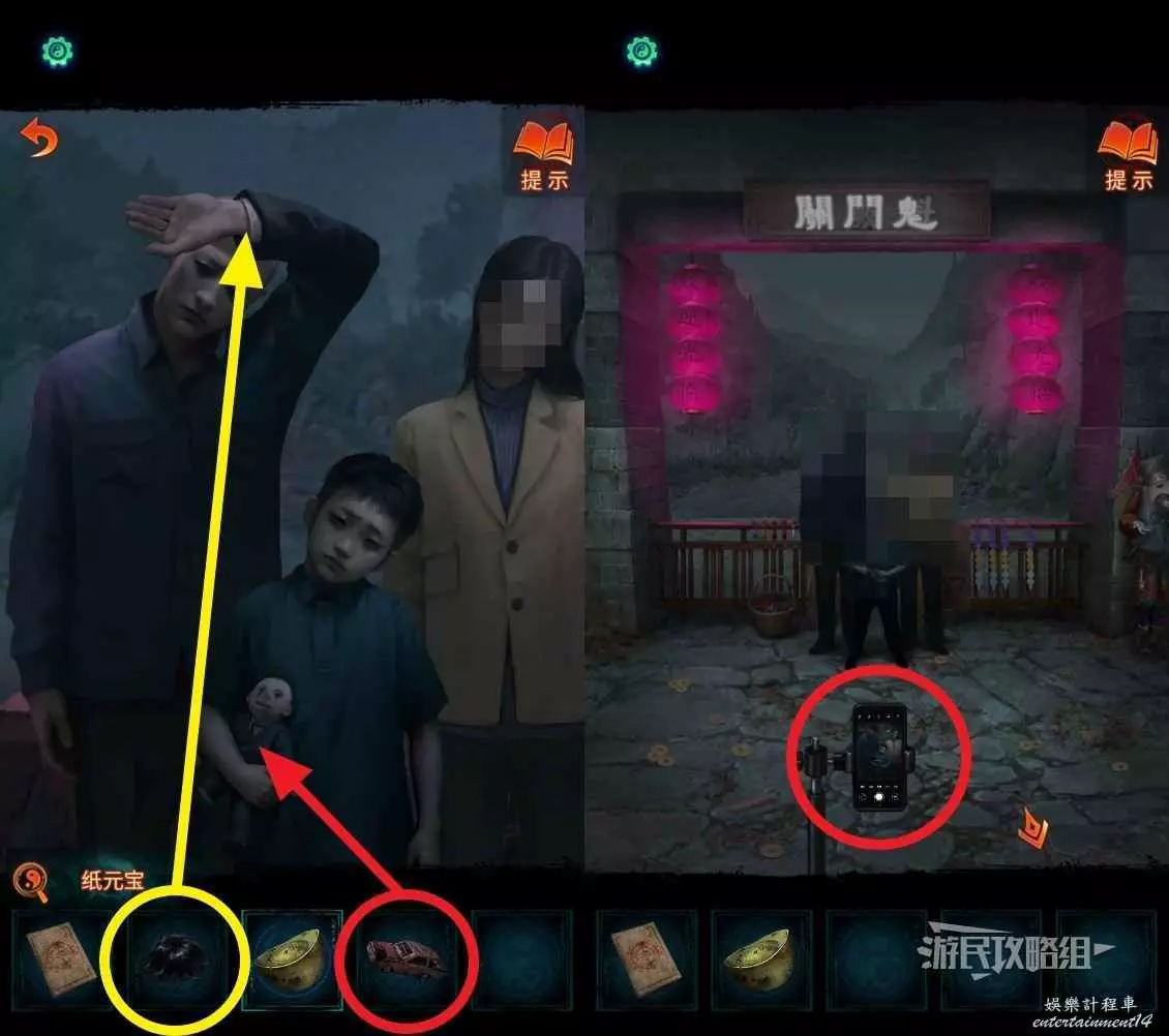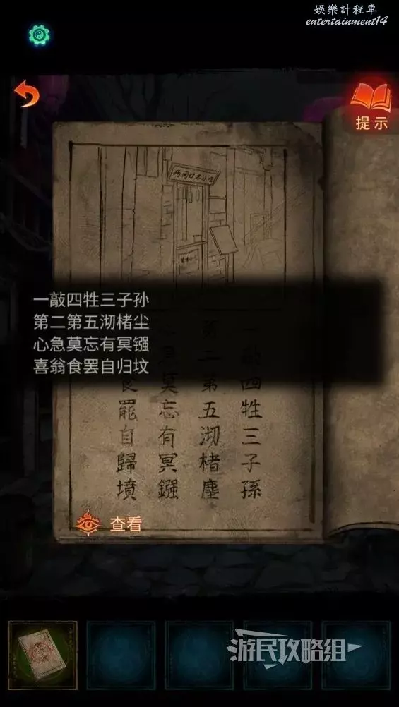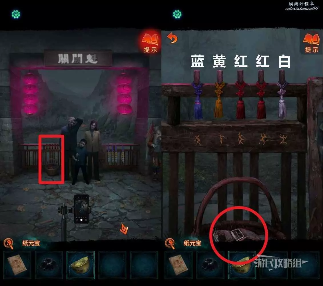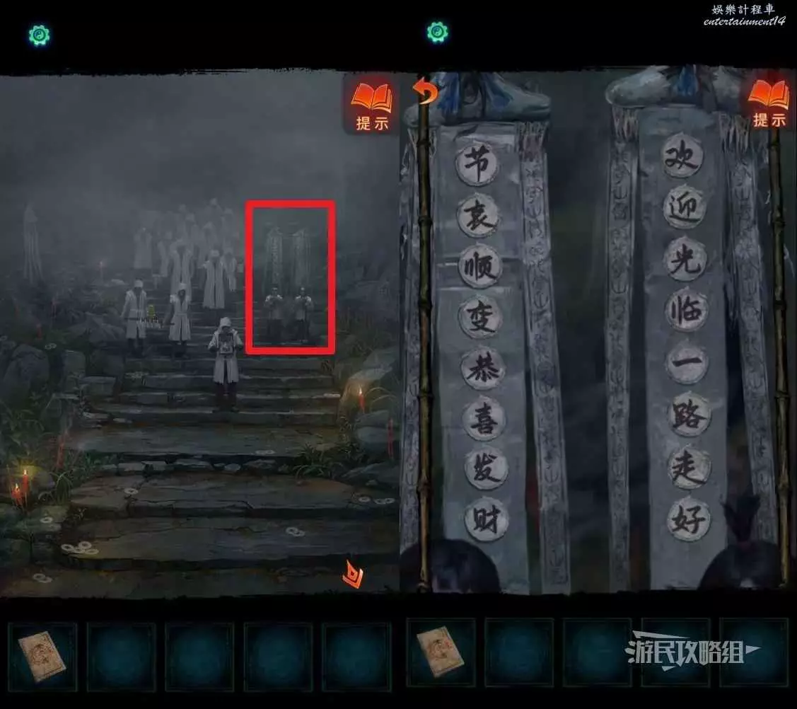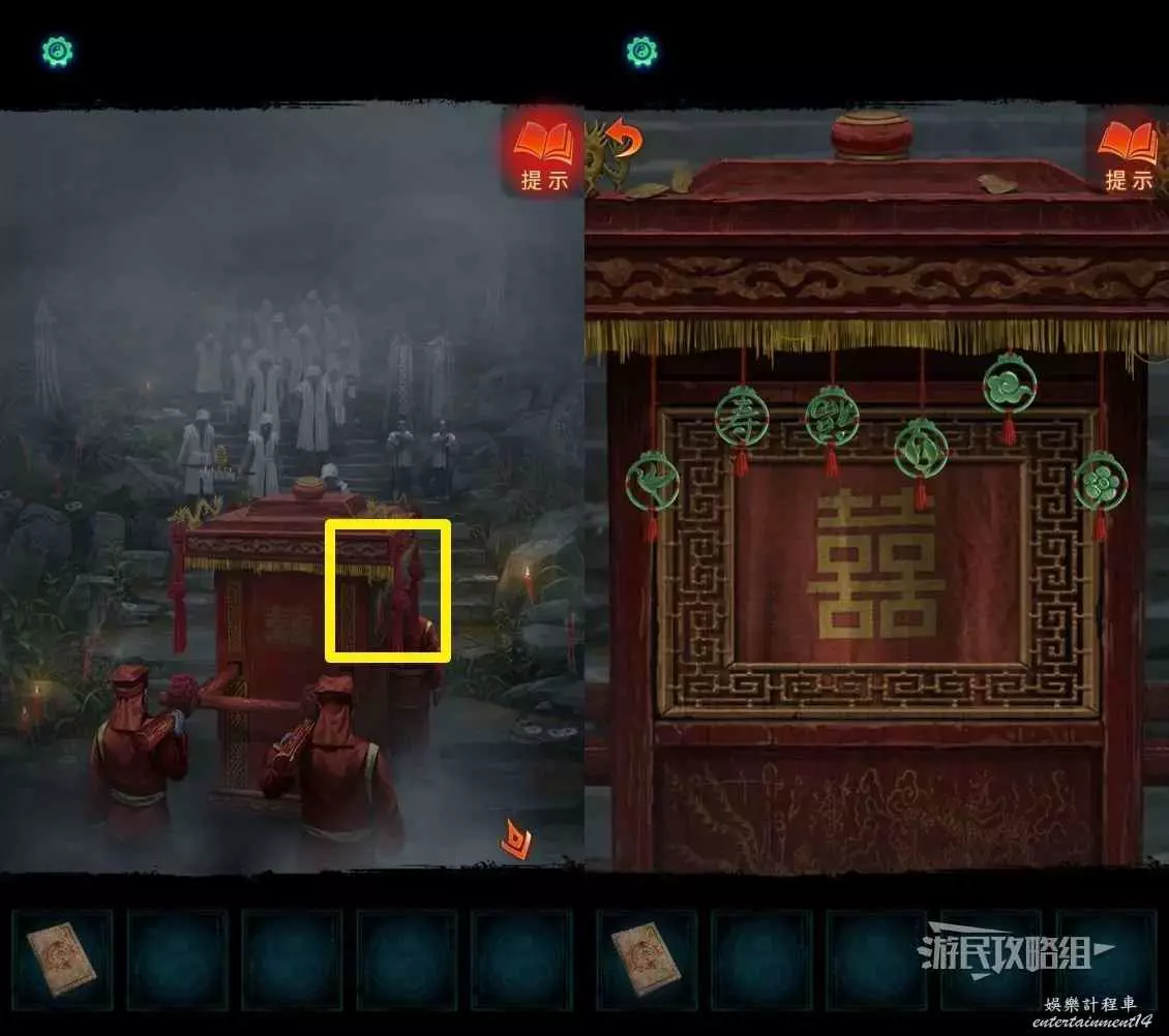 回到剛才喜轎和喪服隊伍所在的區域,點擊右側的一男一女兩個小孩,點擊兩個字交換位置,按照上文得到的順序將字放在正確的位置上。觸發劇情。