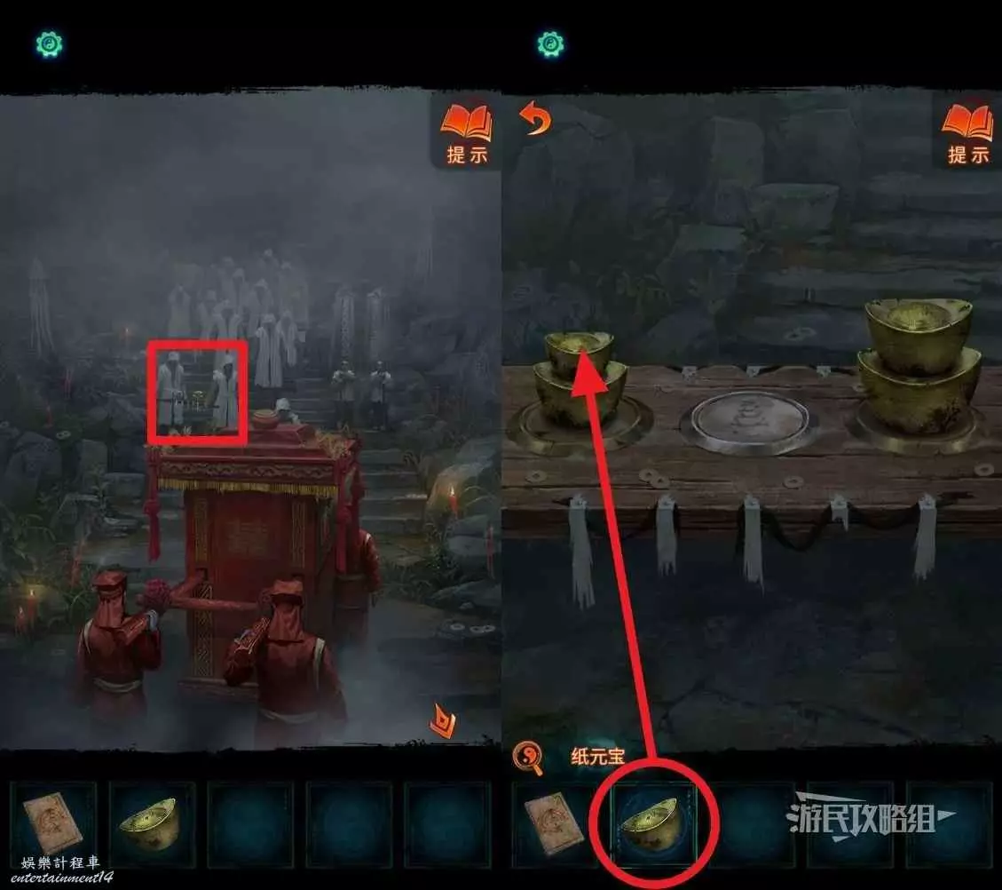 進門後,會出現一群抬喜轎的人和穿喪服的人,先點擊下圖所示喜轎前抬著元寶的兩個白衣人,將道具欄中的【紙元寶】放在他們抬著的元寶上。