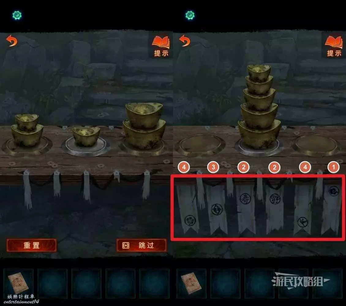 完成謎題後,得到下方線索,記住圖案和其相應的高低位置,參考下圖,從高到低的位置依次為1-4。