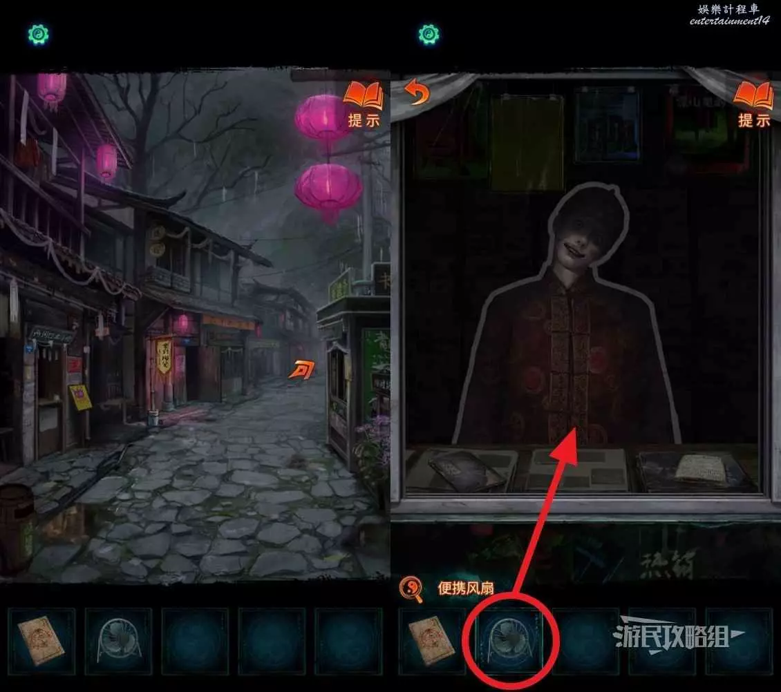 回到最開始小吃店所在的街道,點擊右側書報亭,點擊道具欄的【便攜風扇】放在櫃台上吹送紙人。