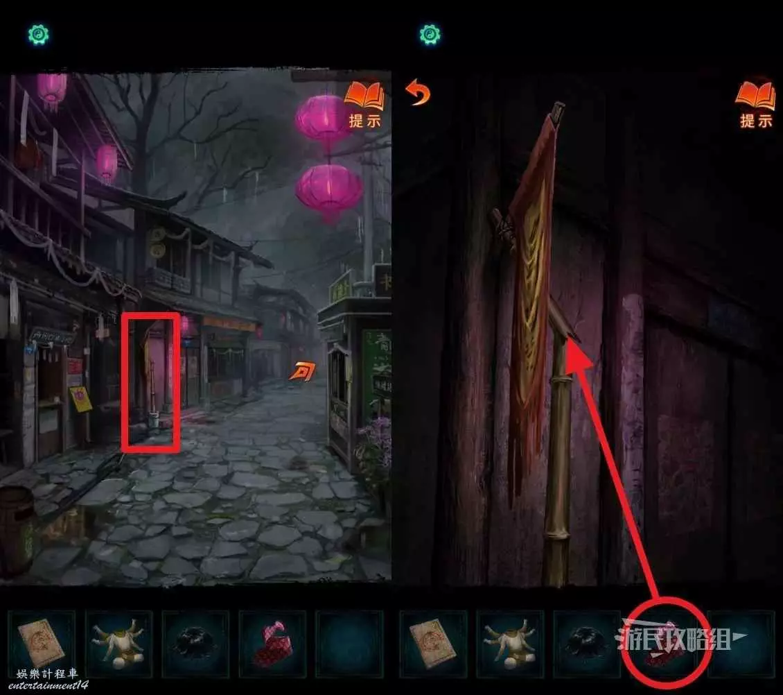 回到最開始的街道上,點擊左側小吃店旁邊斷掉的旗杆,選擇道具欄中的【領帶】將旗杆綁好,開啟陶瓷店。