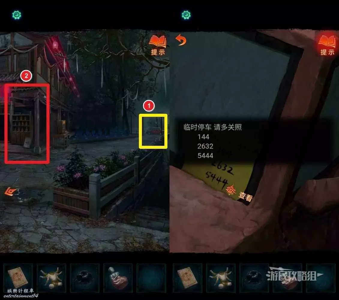 繼續回到剛才盲盒機所在區域,參考下圖,點擊右側黃框(序號①)中的紅色汽車,可以獲得線索挪車電話。這是下方雕像謎題的答案。