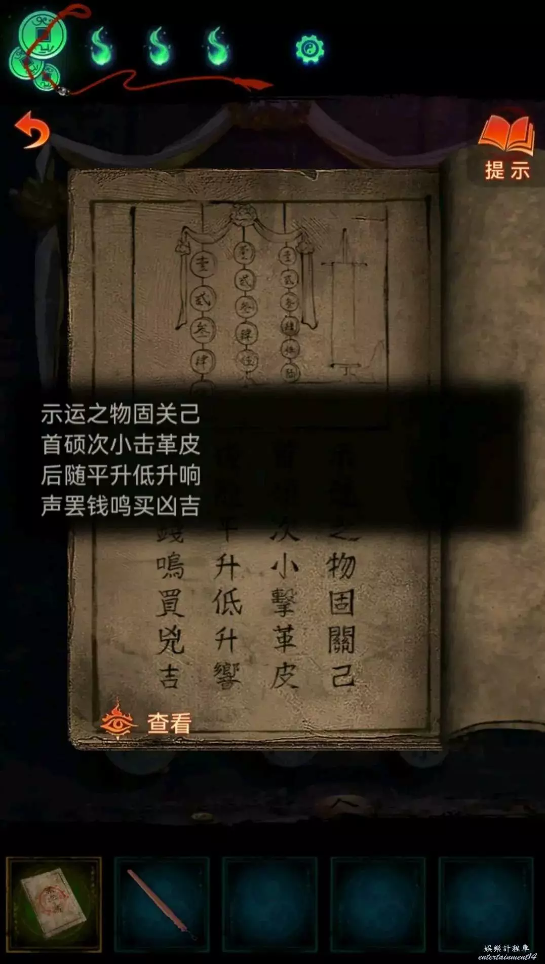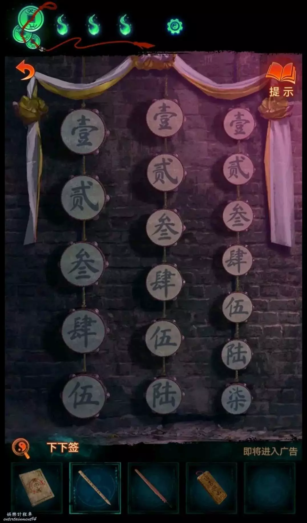 紙嫁衣 7 卿不負 敲鼓謎題解謎攻略 9 8 月 2024-08-09 廣告 作者:滿心歡喜 來源:taptap 首碩次小擊革皮:首碩對應次小,首次是順序,所以先敲左邊最大的(第一個5),再敲右邊最小的(第二個5) 隨後平升低升響:我是看了影片,根據逍遙散人老師說的以7當“低”,可以理解成: 平(在當前大小的鼓)—2 升(升級一個大小規格的鼓)—4 低(降低一個大小規格的鼓)—7 升(升級一個大小規格的鼓)—2 解鎖望遠鏡,望遠鏡看到鼓的廣告牌,上面的電話是552472,對應到敲鼓順序為: 大5—小5—小2—中4—小5—中2