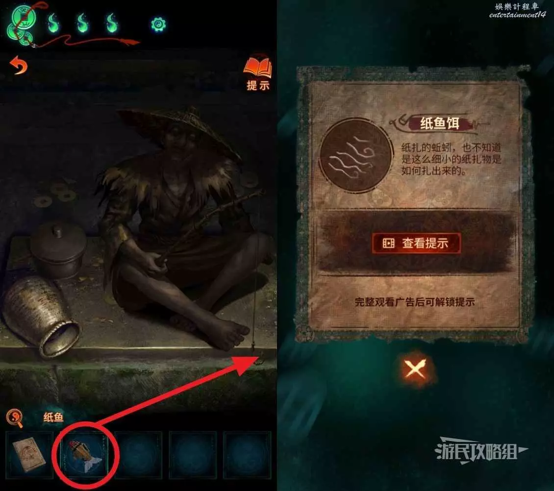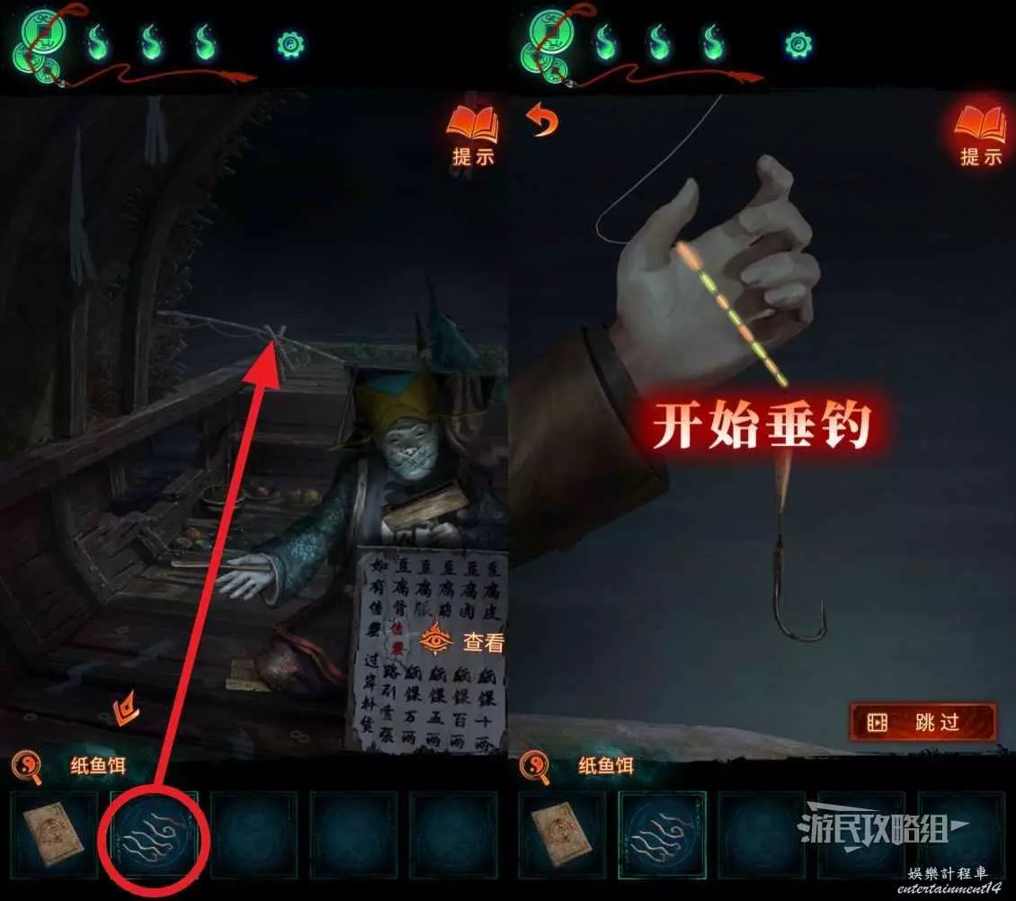 返回算命攤所在區域,點擊介面右下角的釣魚佬,選擇道具欄中的【紙魚】掛在他魚竿的鉤子上,然後從他身邊的罐子裡拾取【紙魚餌】。