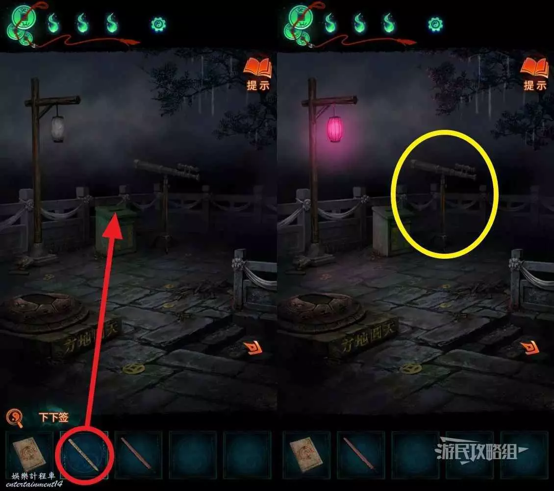 打開紙人的手,進門上樓,到達新區域。選擇道具欄中的【下下簽】,放入望遠鏡旁邊的綠色箱子中,燈亮後,點擊望遠鏡。