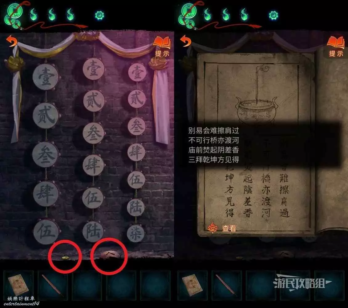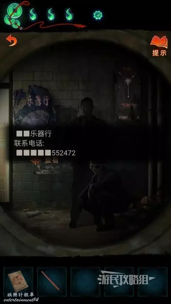 返回算命攤所在區域,點擊旁邊的鼓,結合之前書上寫的線索一擊數字【552472】得到敲鼓謎題的答案,參考下圖。