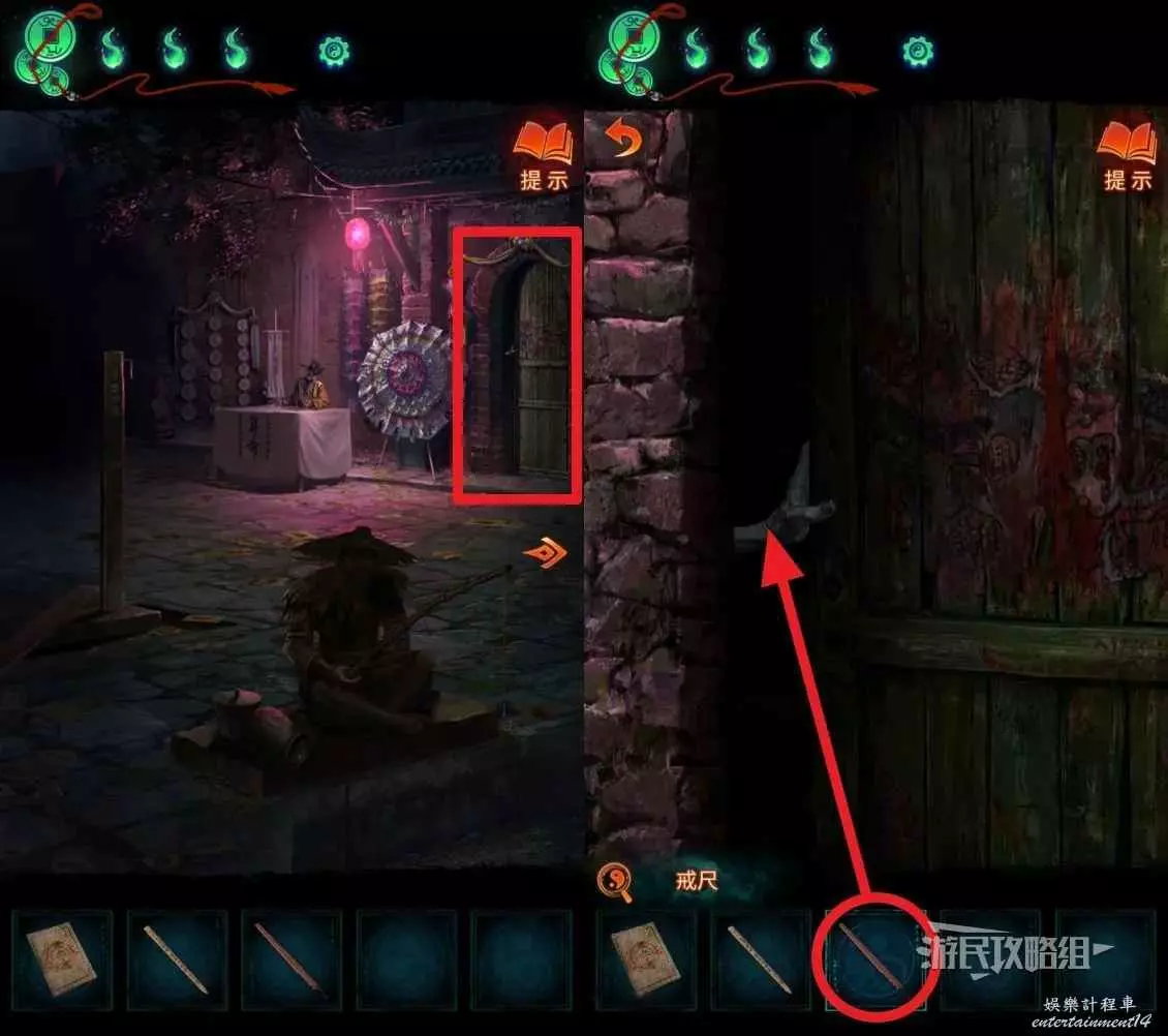 從壞道士那裡拿到【戒尺】後,回到算命攤所在區域,點擊旁邊紙人擋住的門,選擇道具欄中的【戒尺】,打紙人的手。