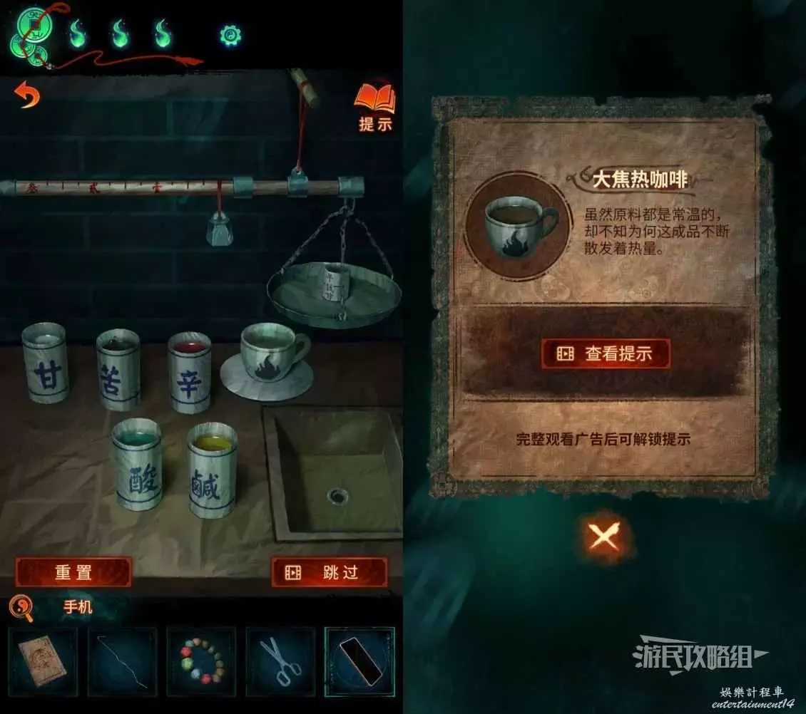 大焦熱咖啡的配方是【辛三錢、苦一錢半、酸一錢】,這裡需要了解傳統秤桿的使用方法,調平即秤砣和物品重量相等。簡單的單位換算小遊戲,如果嫌麻煩可以直接看廣告跳過。