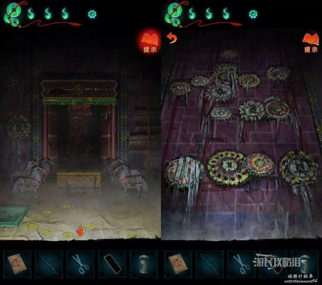 進入地藏王菩薩廟,數出廟內馬的數量為【6】;點擊諦聽所在大門左側的花圈,記住花圈組成的漢字為【七一】;地上散落的黃色花錢有【7】枚。