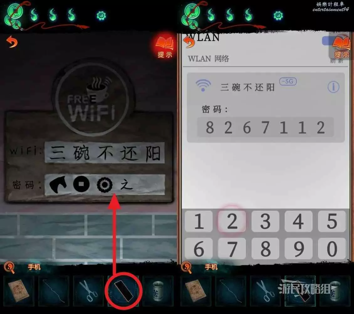 所有數量都記好後,點擊櫃台右側牆上的WIFI密碼牌,選擇道具欄中的【手機】再次點擊WIFI密碼牌,輸入【8267112】連接。
