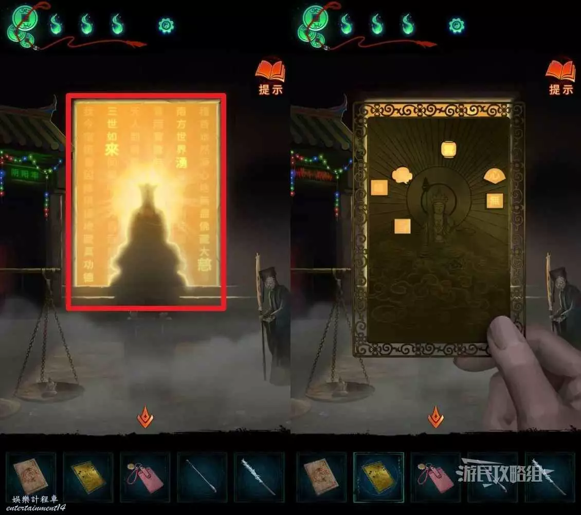 紙嫁衣 7 卿不負 第四章舞台花盆文字順序正確答案 10 8 月 2024-08-10 廣告 作者:瑞破受氣包 來源:遊民星空 在陰陽牢入口處可以看到一尊佛像和金色的電子屏風,在此處使用道具欄中的金色卡片(第四章開頭通過倒吊的服務生紙人獲得),獲得卡片空洞處顯示的字【緣、心、無、雲、贊、菩】,順序就是空格裡的字亮起來的順序。 回到有劇團演出的房間,點擊下方放著花的方盆,根據上方金色卡片獲得的線索逐一點擊對應的字【緣、心、無、雲、贊、菩】,順序就是空格裡的字亮起來的順序。 然後花盆裡會伸出一朵花,點擊三次獲得【木魚棒】。