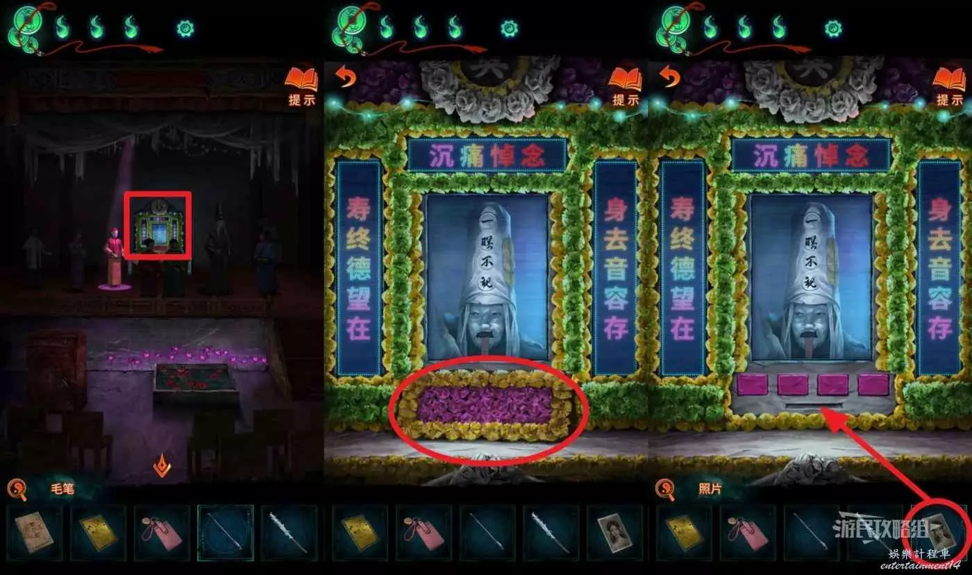 進入有演出舞台的房間(牢房旁邊的門),點擊舞台上發光的電子靈位,記住照片上白無常的臉和帽子上的字,這是後面謎題的線索。點擊照片下方紫色的花挪開板子,出現四個按鈕和一個長方形縫隙,選擇道具欄中的【照片】放進縫隙中(之前從獄卒那裡拿到的言她的照片)。