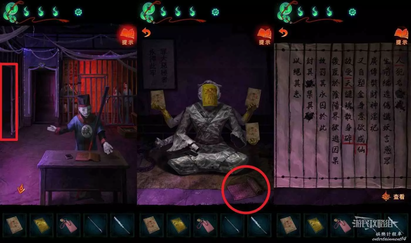 進入陰陽牢後,點擊介面左側的門,看到一個六條手臂的紙人,點擊紙人前面的紙紮竹簡得到挽聯的線索。