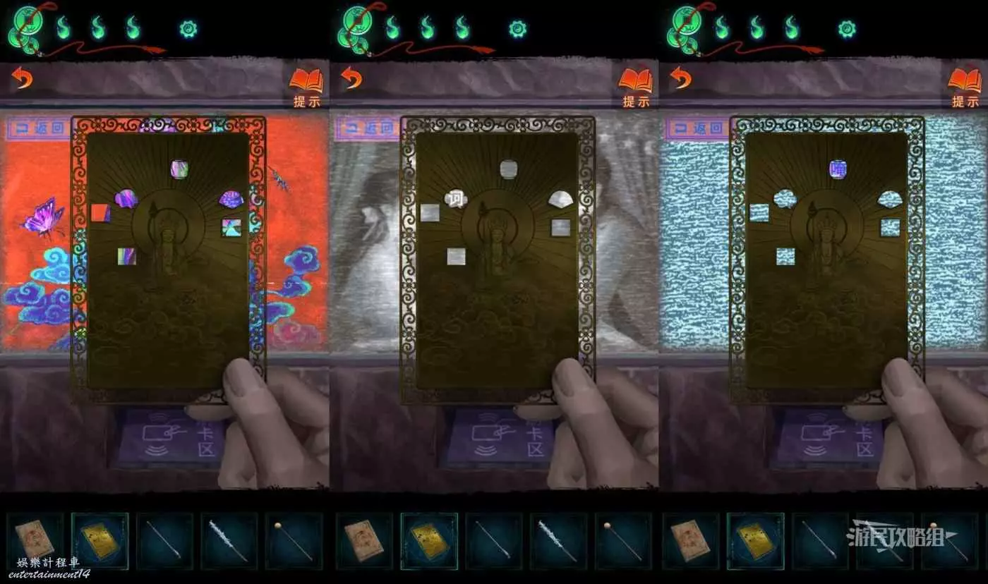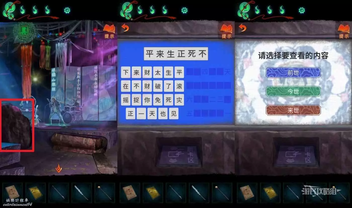 分別查看前世、今世和來世的內容,使用道具欄中的金色卡片,獲得字與對應的形狀。這是後面密碼鎖的答案。