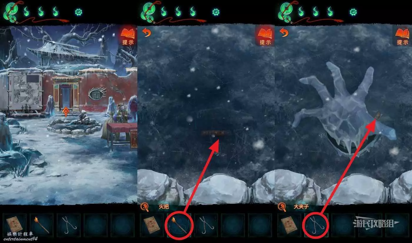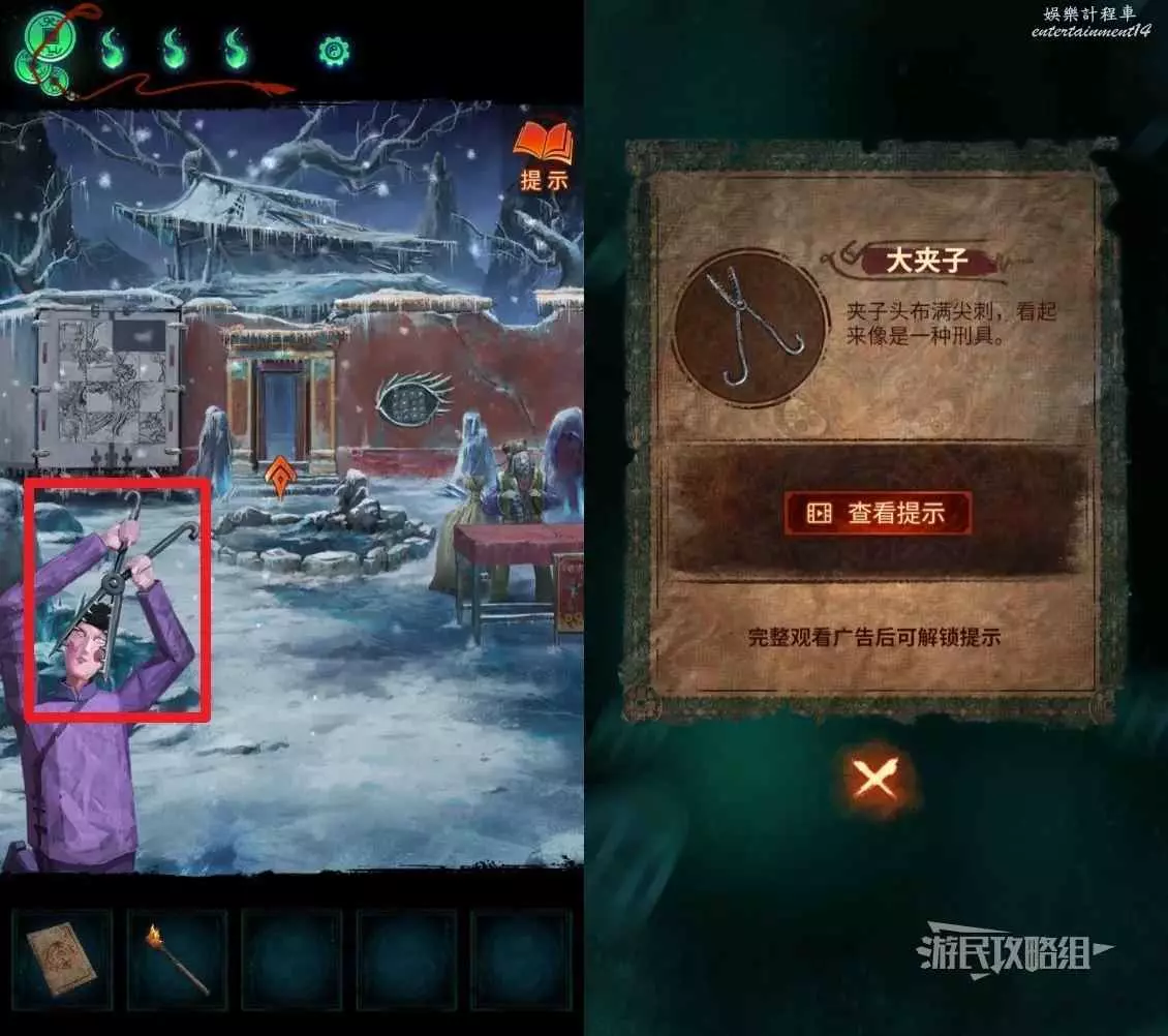 注意前方融冰有小高能。點擊介面中間的水池,選擇道具欄中的【火把】融化冰面,然後選擇道具欄中的【大夾子】,獲得印有圖案的尺子。