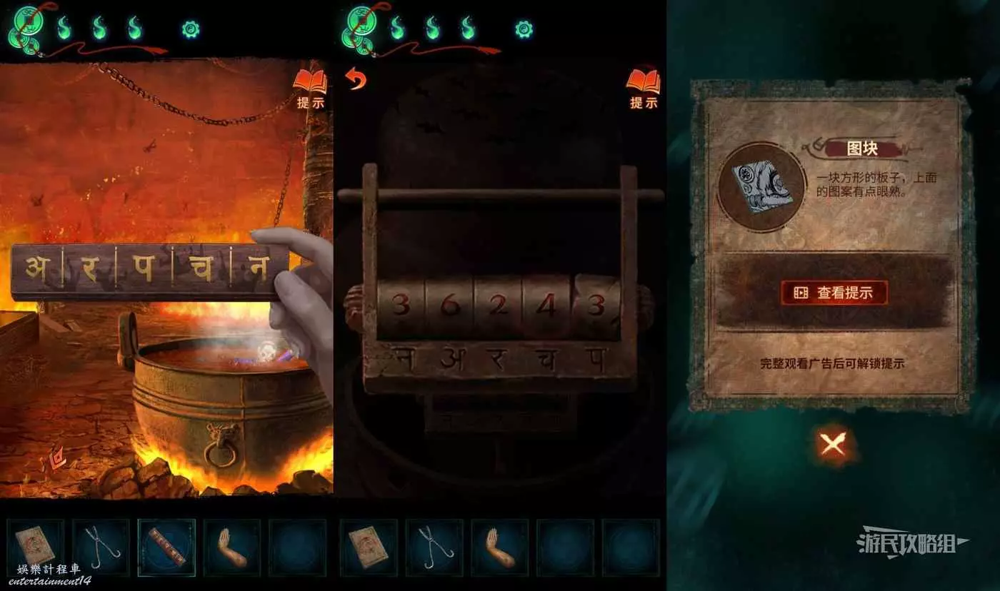 正確的密碼為【3-6-2-4-3】。返回廟內的爐子處輸入正確密碼,拾取【圖塊】。