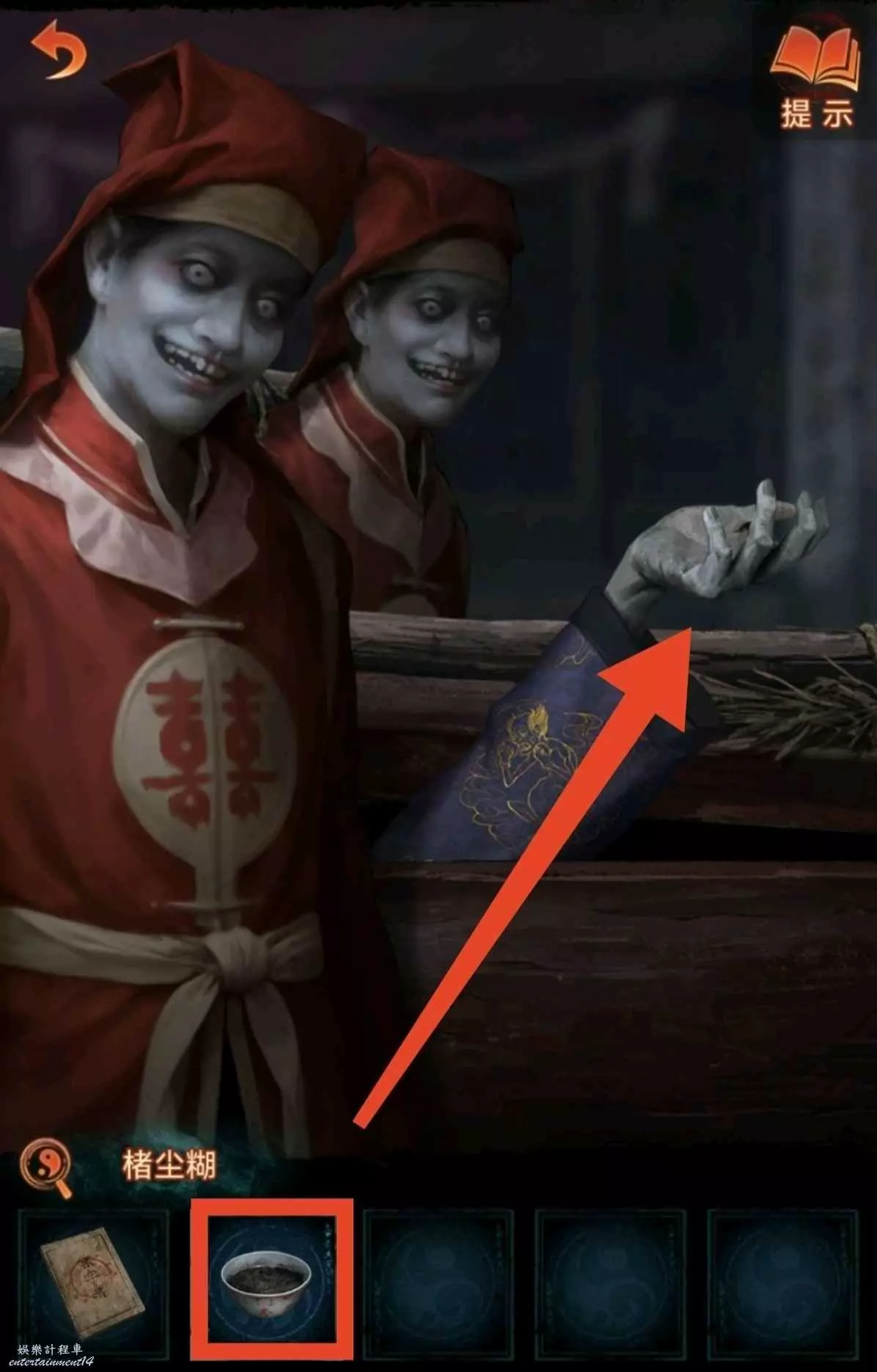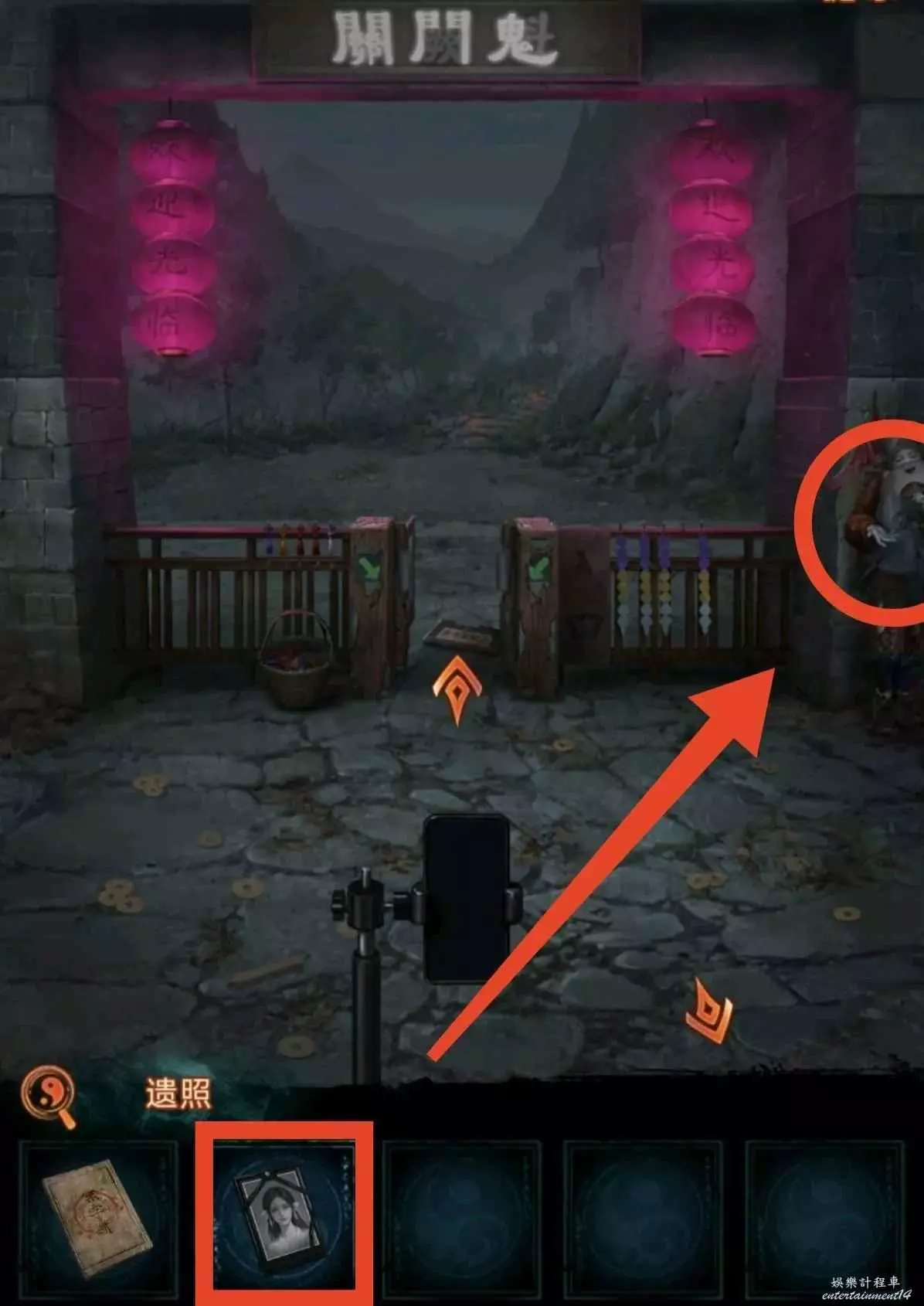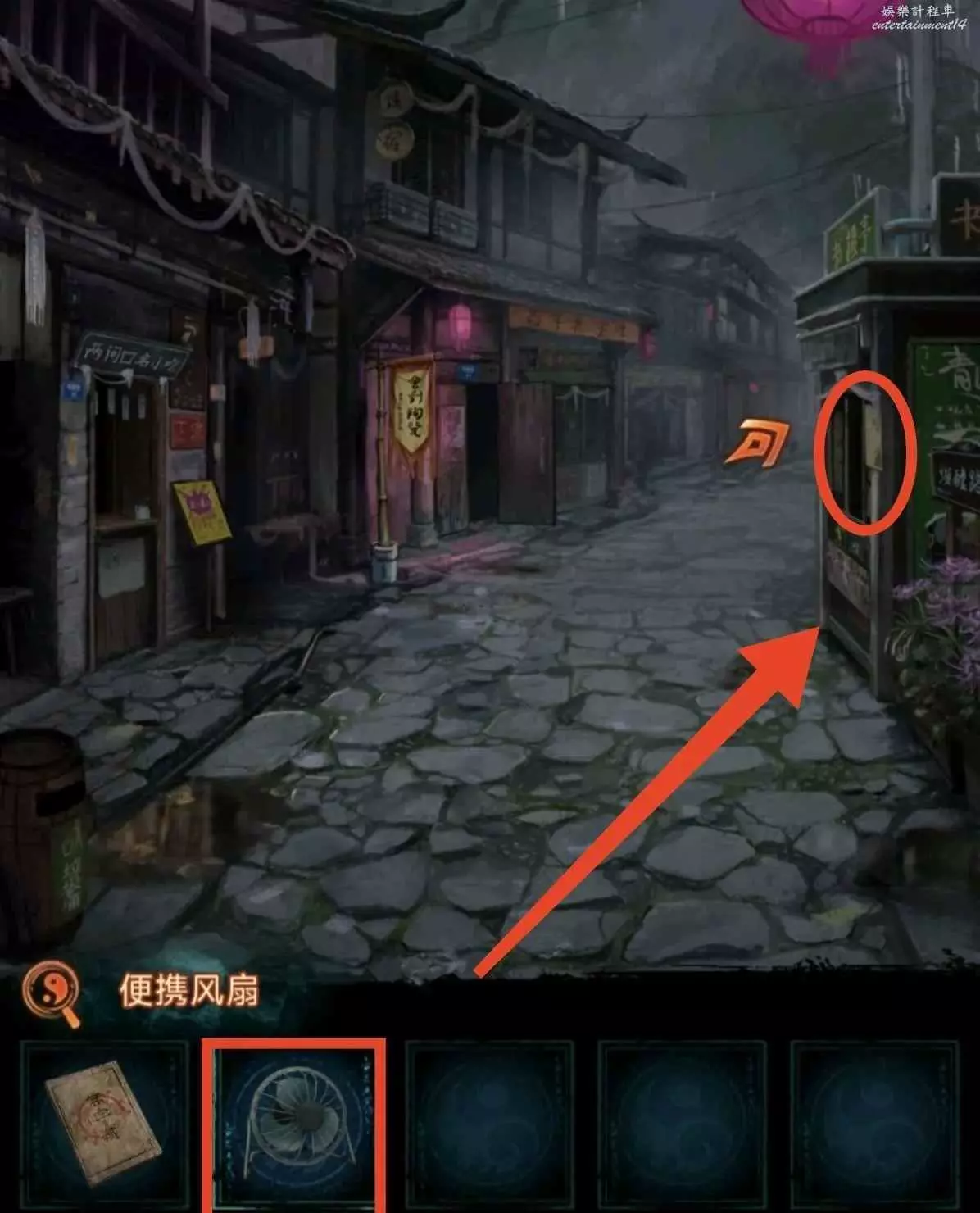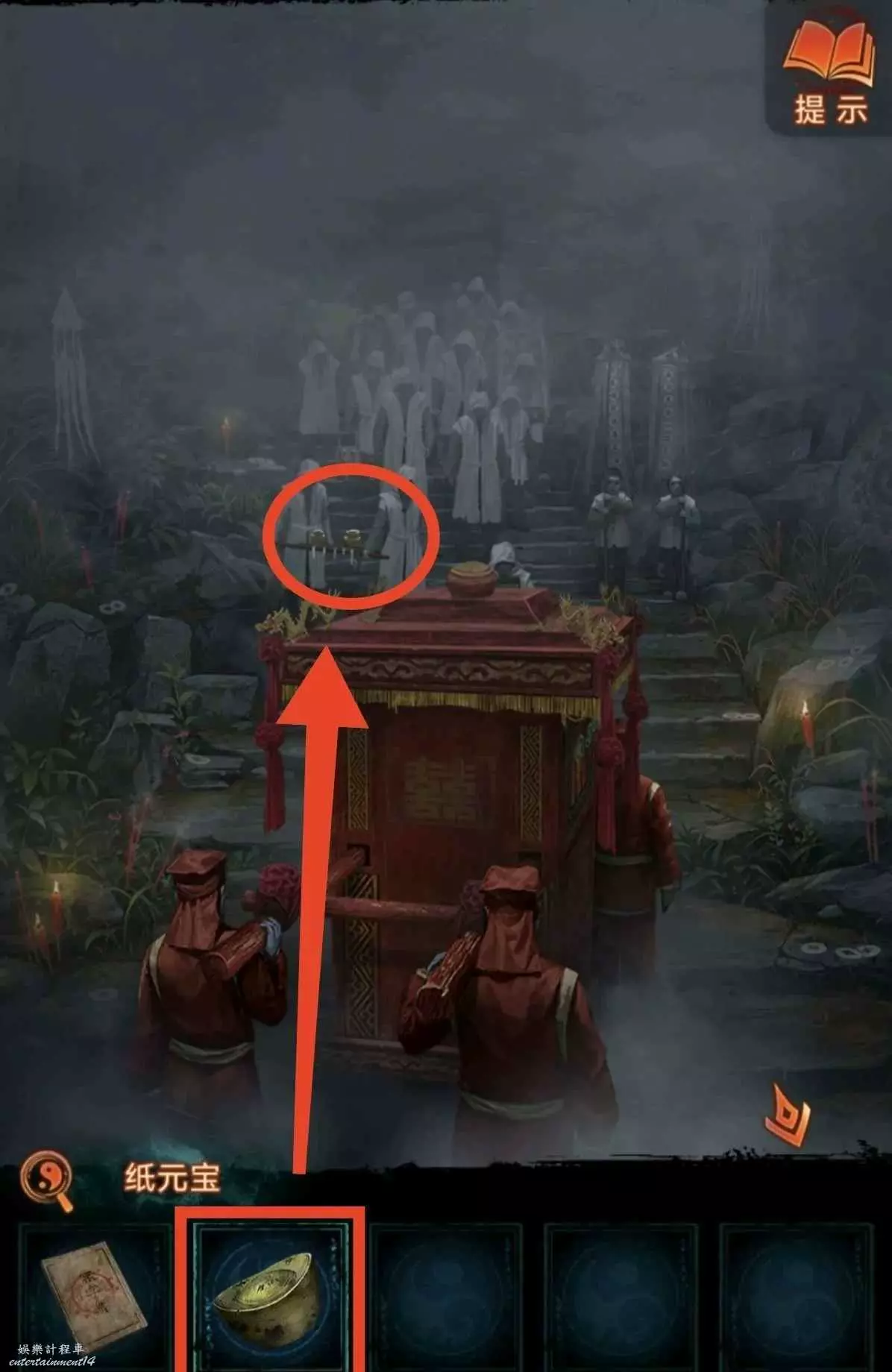 6、根據線索2,點擊紅轎子的掛玉,轎子走後顯現拿著遺照的“人”,對他說“拿來吧你”獲得紙7女主遺照,用遺照找老八換小風扇,回鎮上去報亭把紙人吹倒獲得線索3,回鬼門關找童男童女根據線索3調換字序通關。