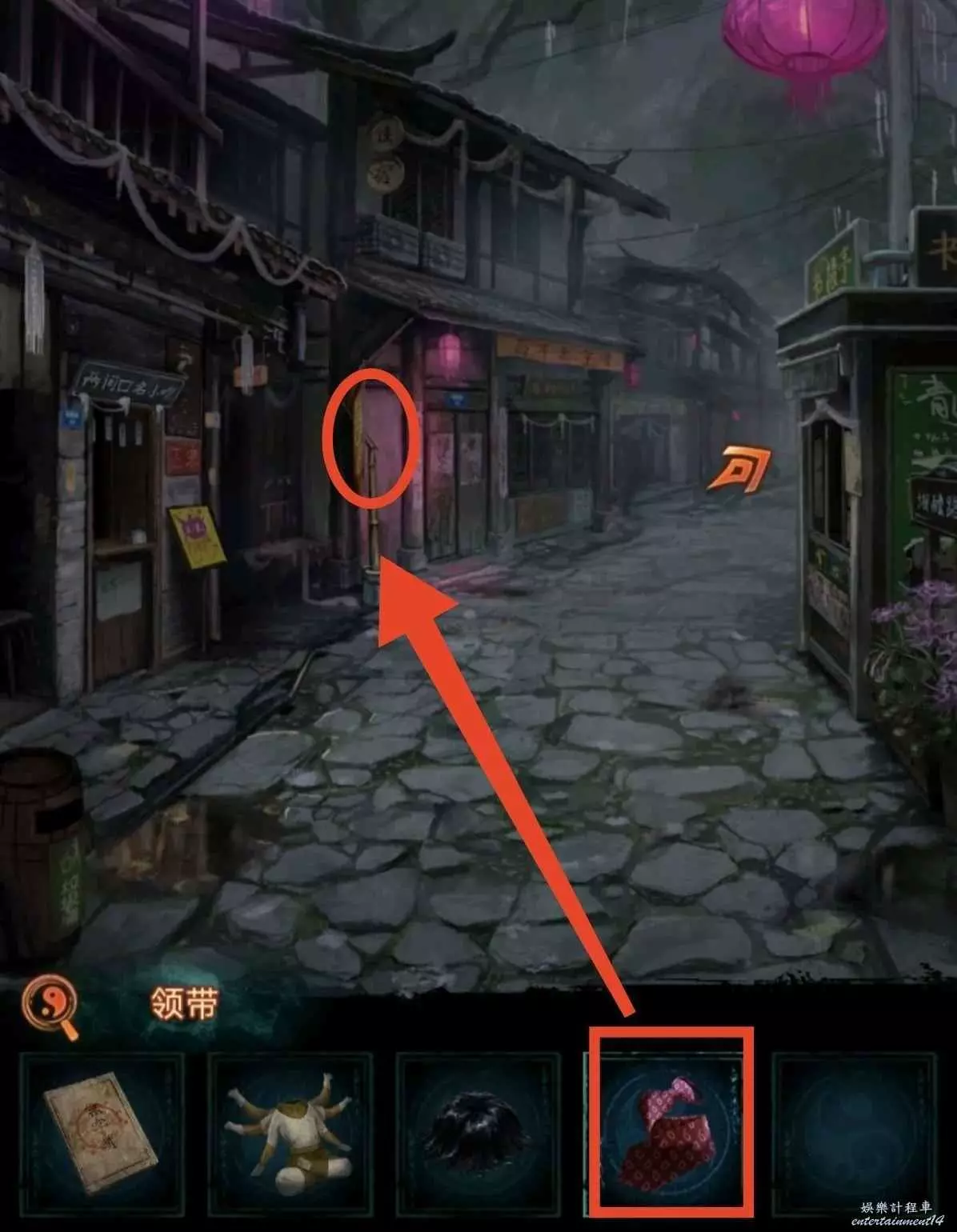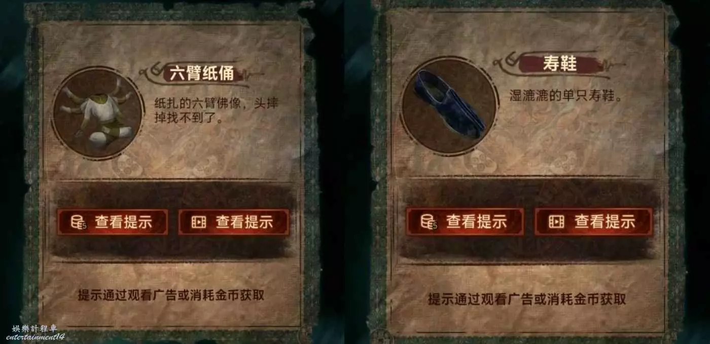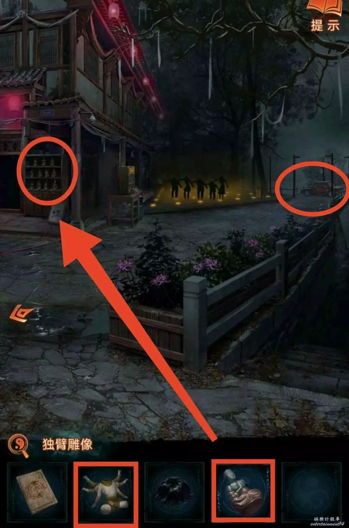 6、根據線索2,點擊紅轎子的掛玉,轎子走後顯現拿著遺照的“人”,對他說“拿來吧你”獲得紙7女主遺照,用遺照找老八換小風扇,回鎮上去報亭把紙人吹倒獲得線索3,回鬼門關找童男童女根據線索3調換字序通關。