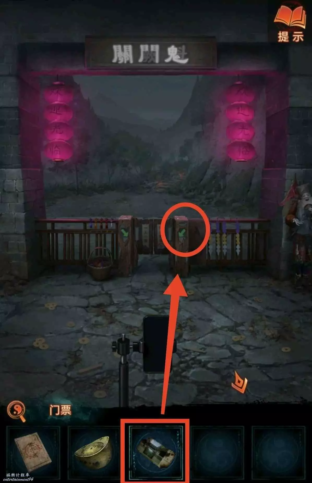 5、把硬幣塞盲盒機裡,獲得門票,進鬼門關玩漢諾塔小遊戲獲得線索2。