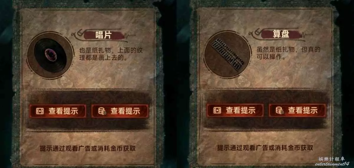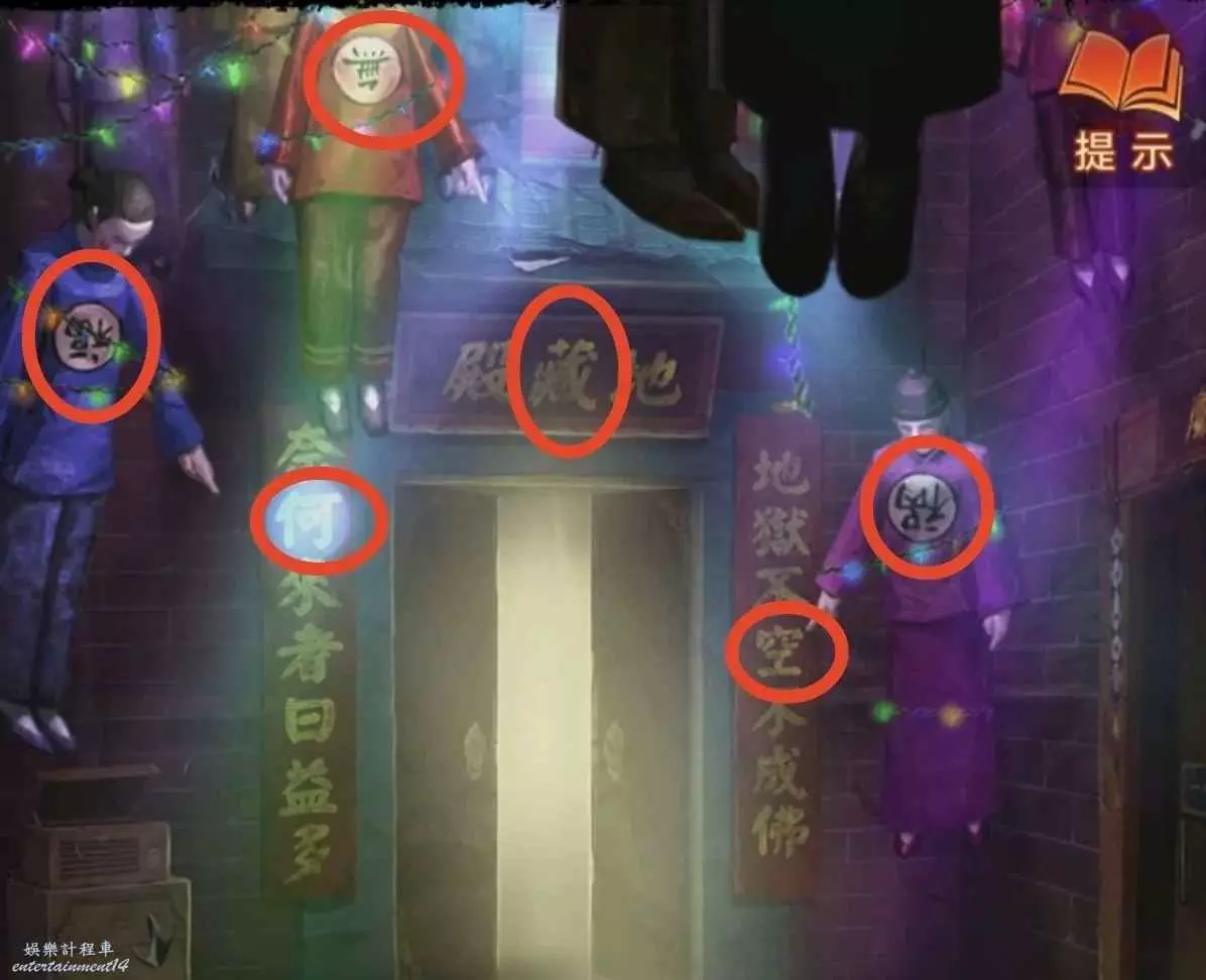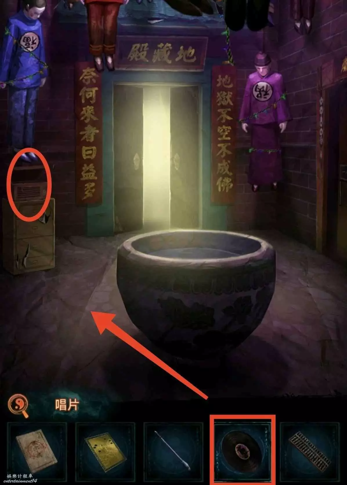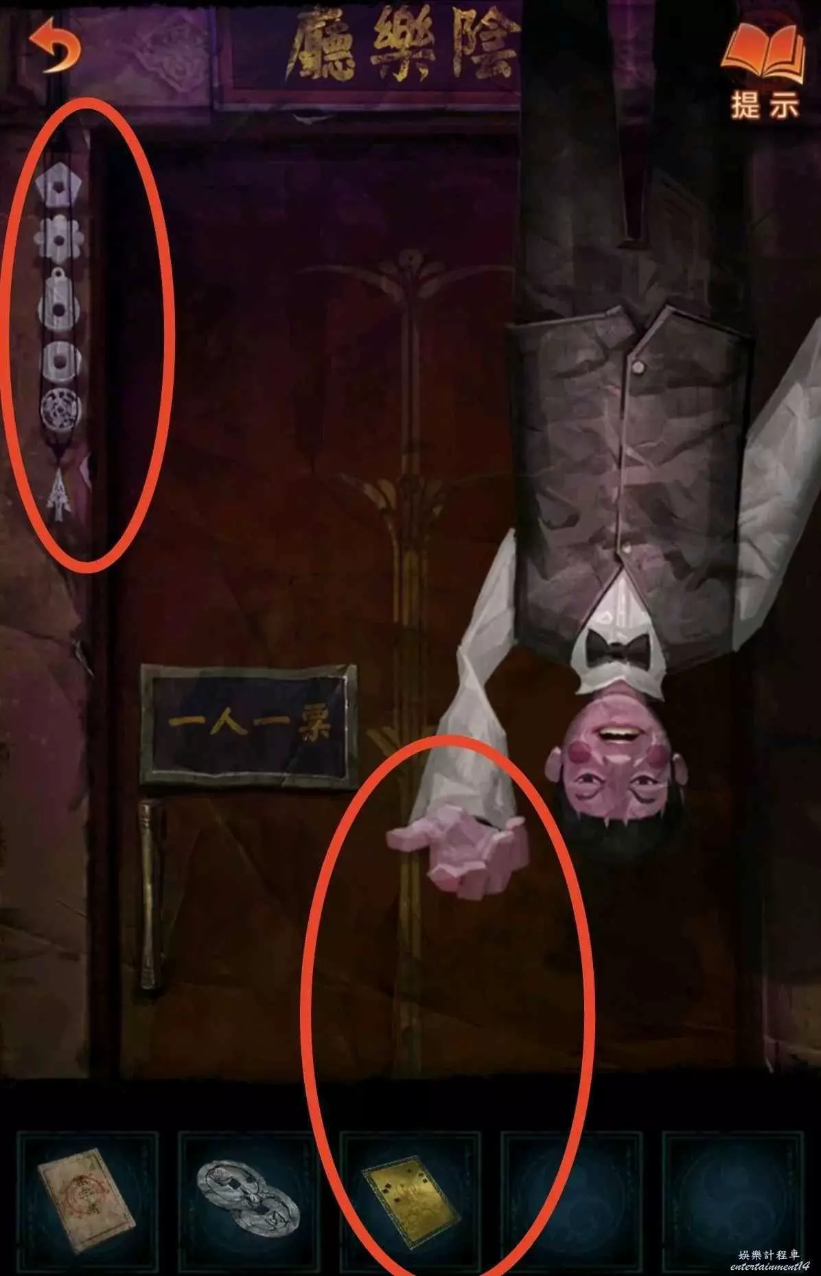 1、先去右邊倒掛人手裡拿答題卡,線索6在左邊門上,去唱片機拿五枚銅錢,然後去中間水缸拾取倆花錢,把銅錢擺上,按線索6順序以此點擊(線索6箭頭從下往上),如圖所示,投完開門。