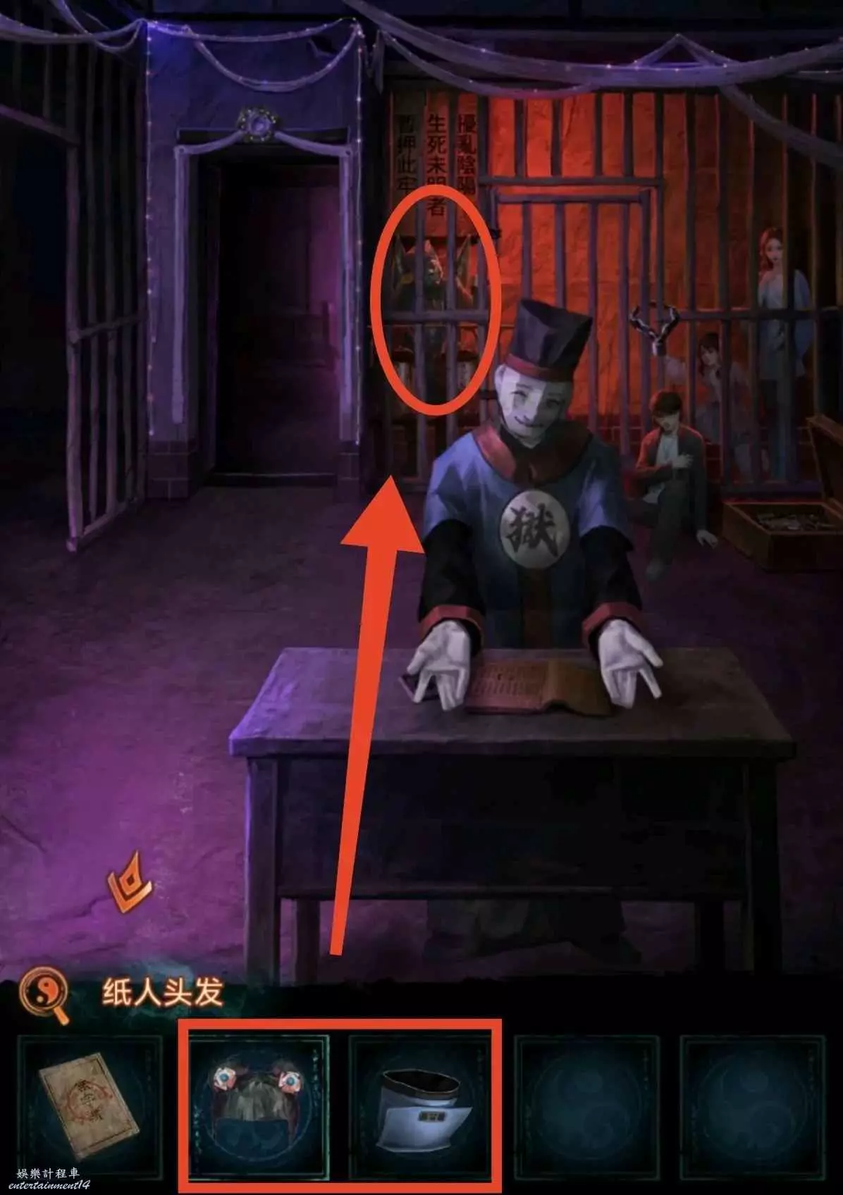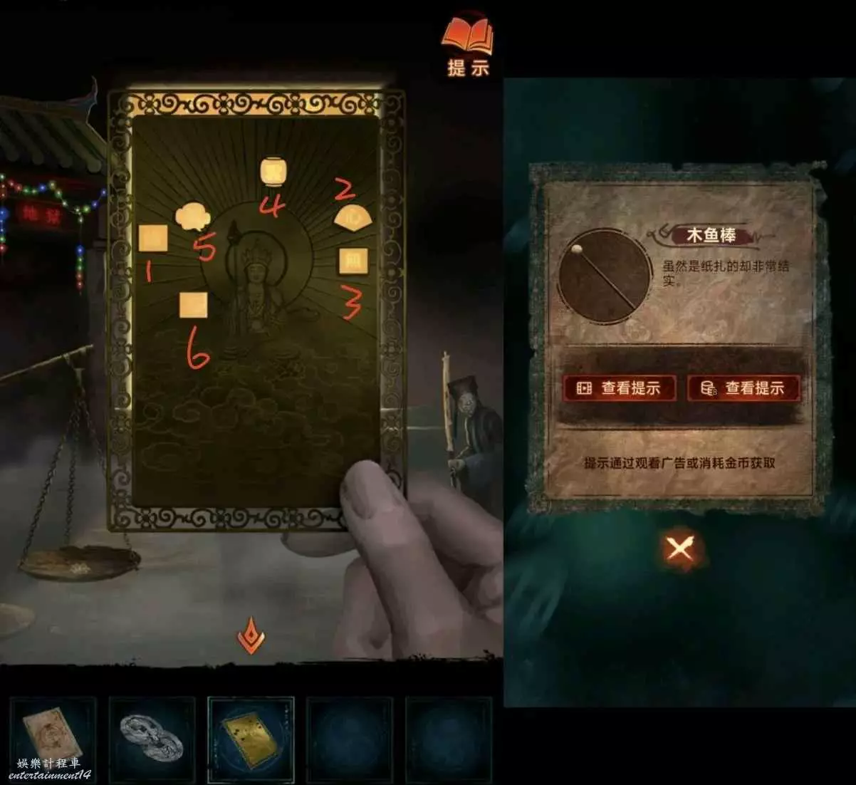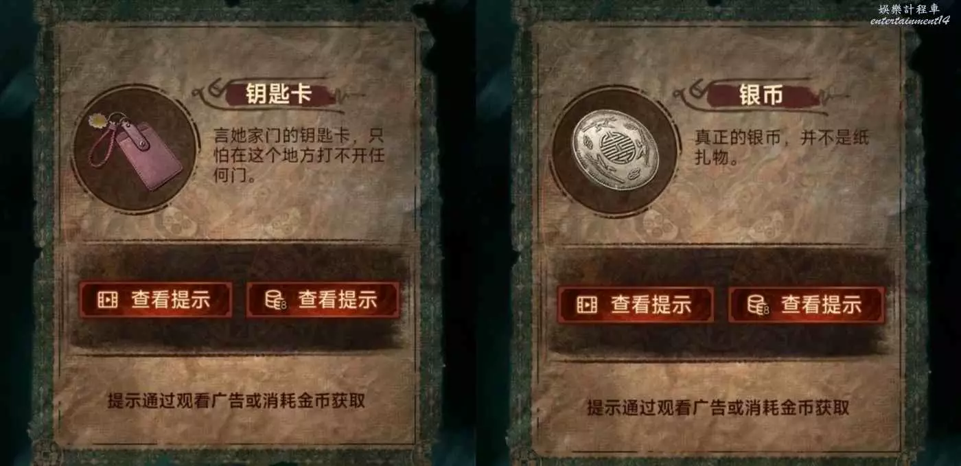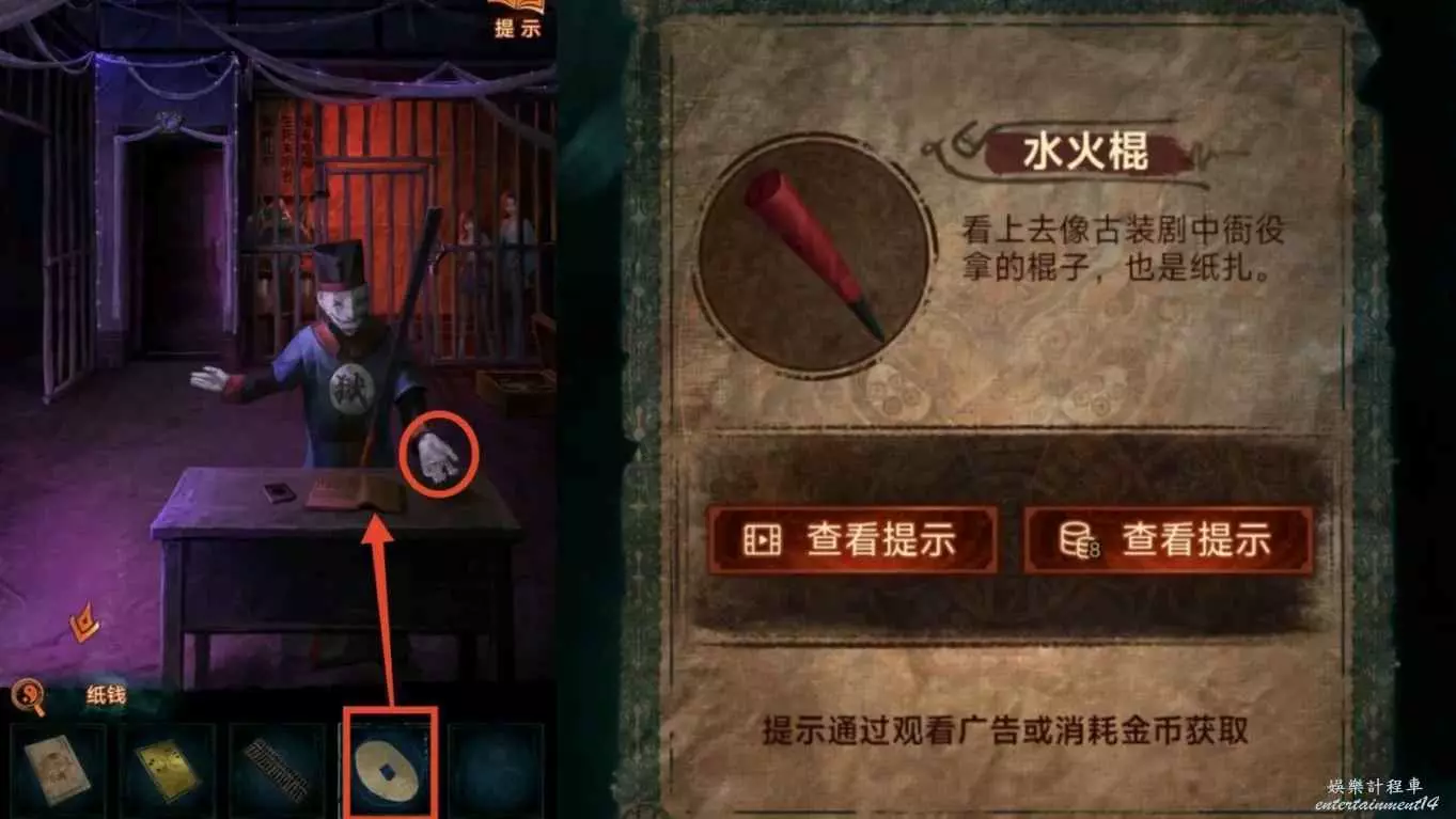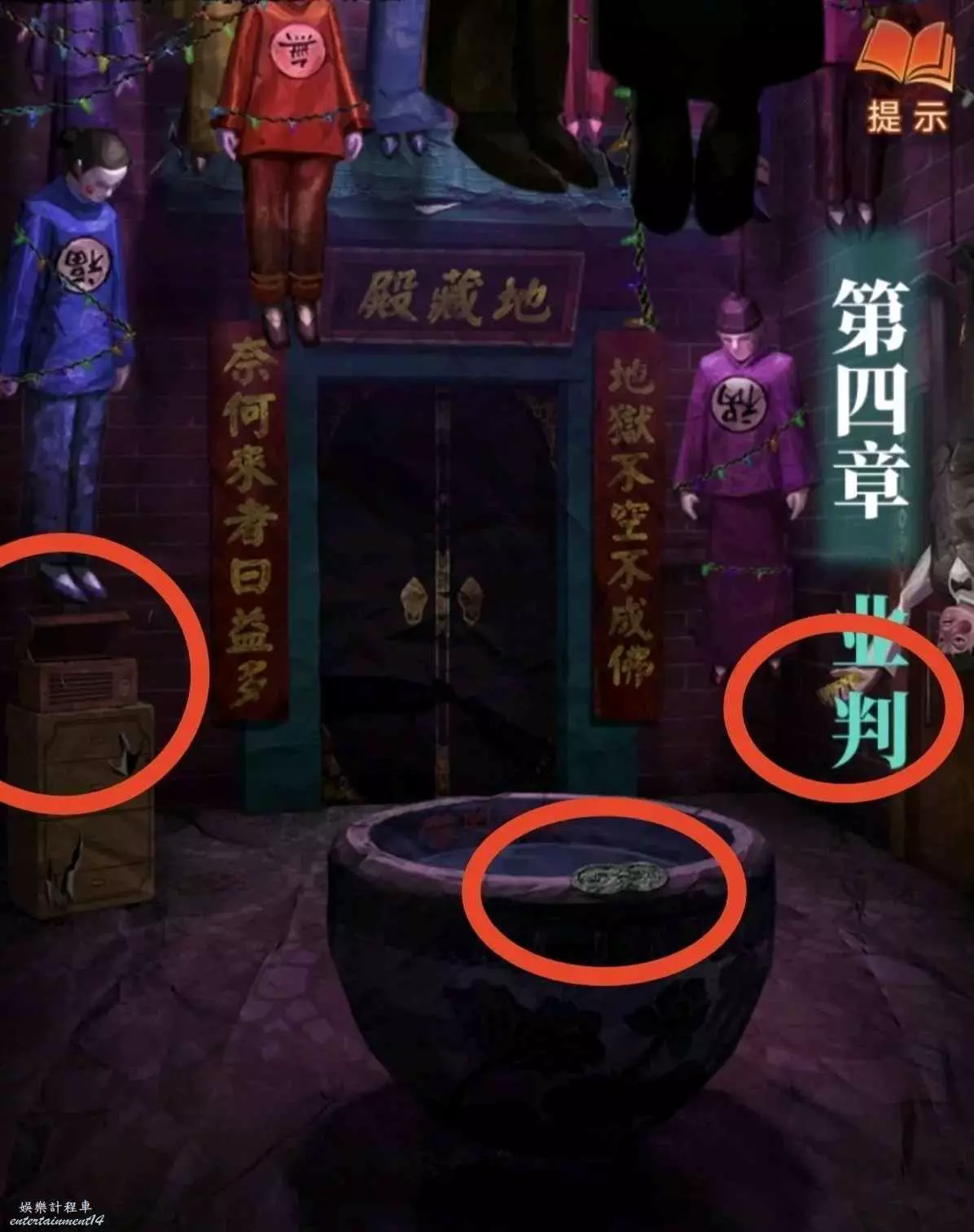 1、先去右邊倒掛人手裡拿答題卡,線索6在左邊門上,去唱片機拿五枚銅錢,然後去中間水缸拾取倆花錢,把銅錢擺上,按線索6順序以此點擊(線索6箭頭從下往上),如圖所示,投完開門。