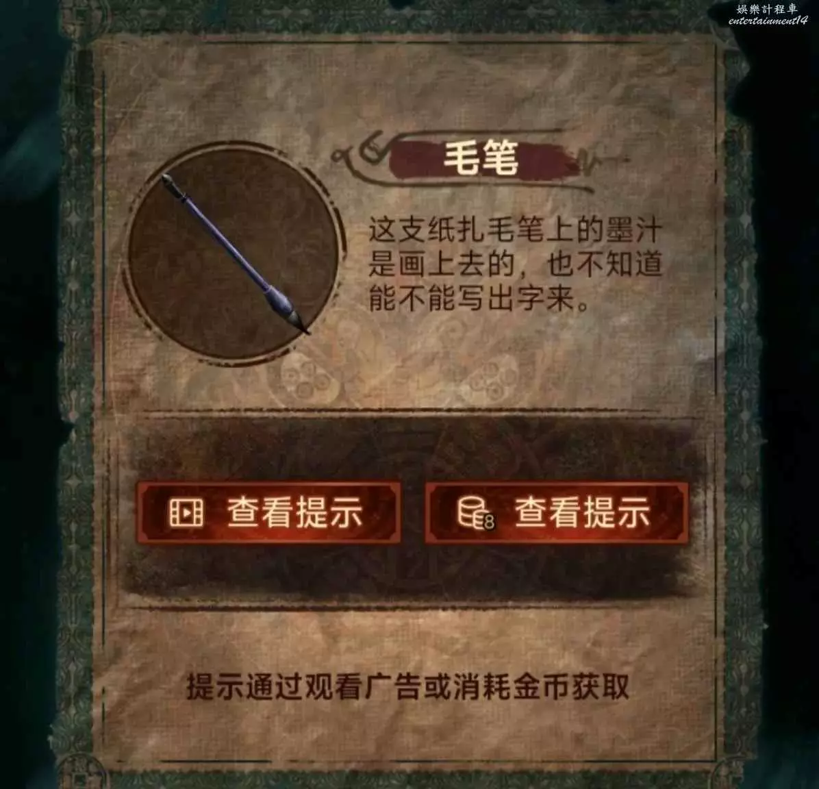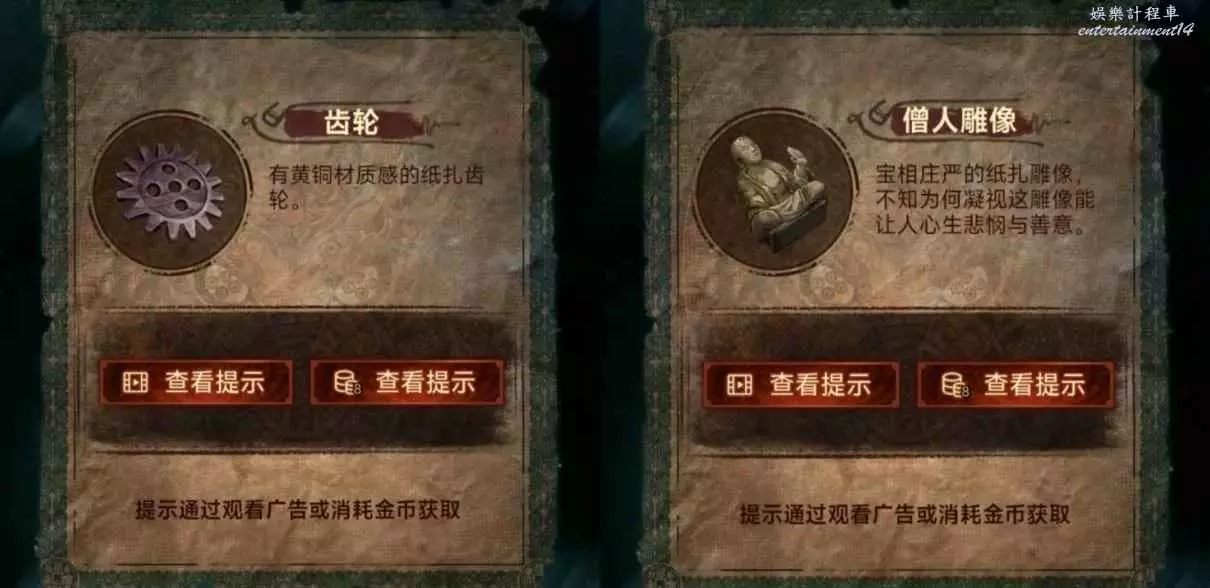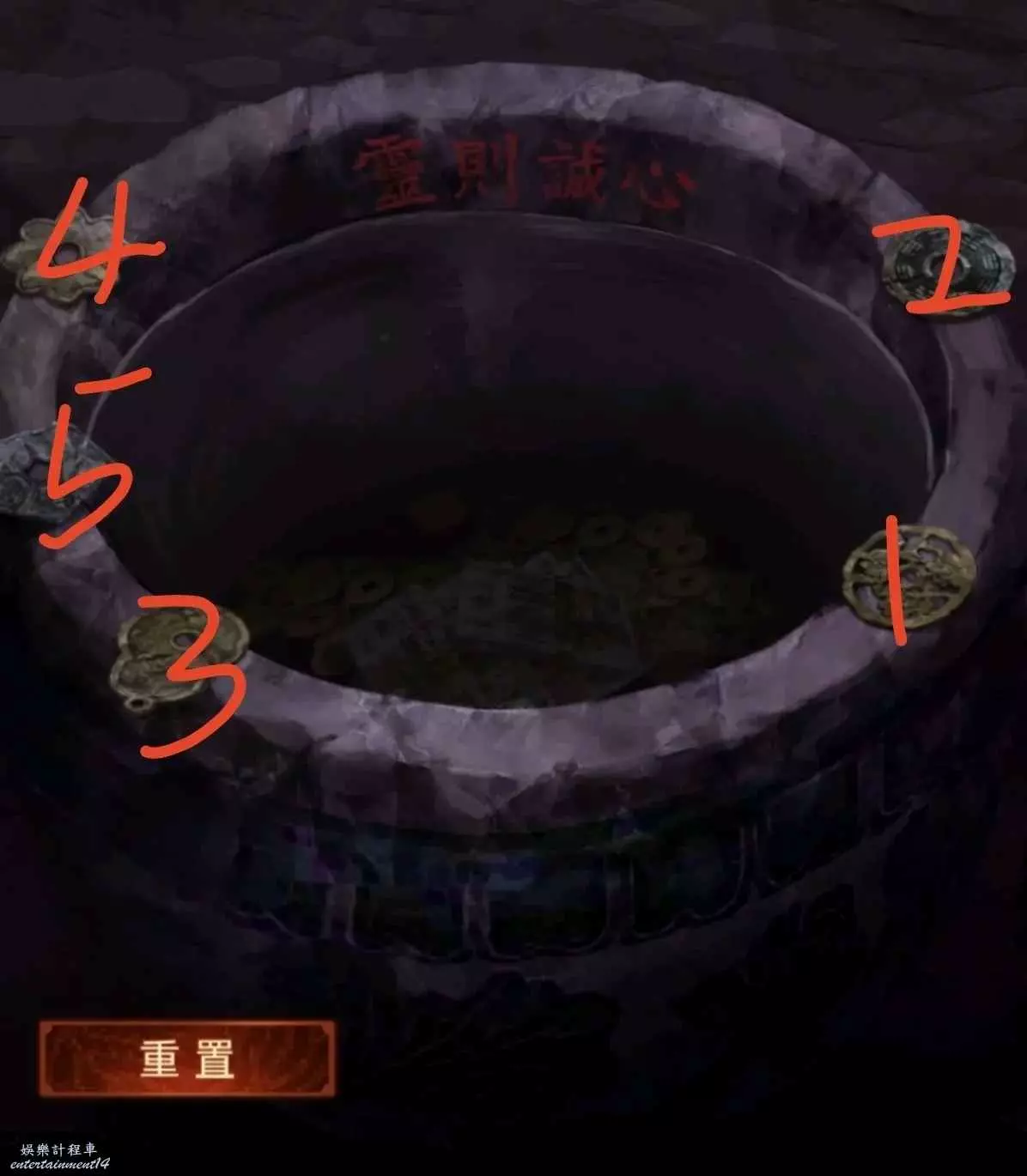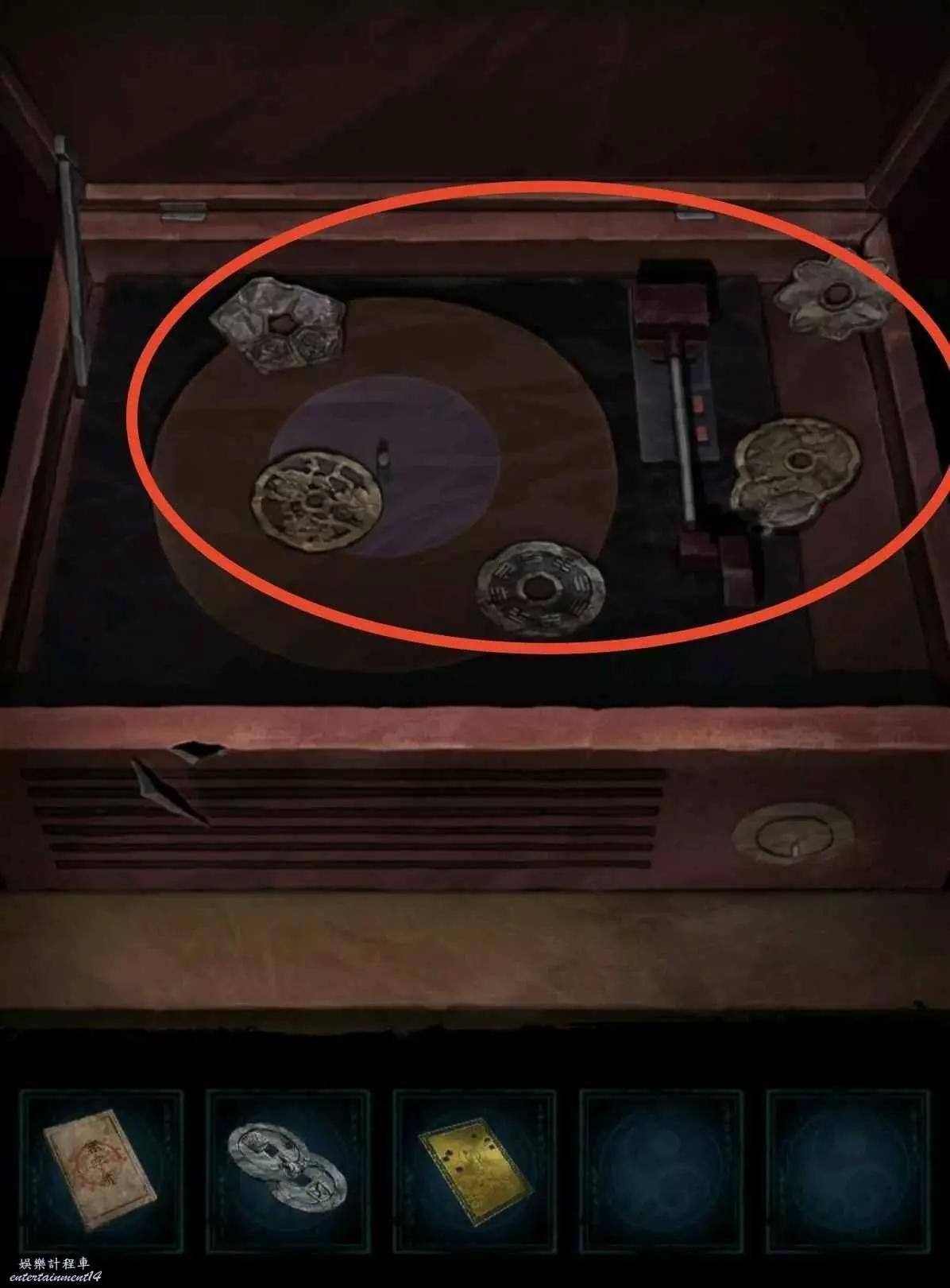 1、先去右邊倒掛人手裡拿答題卡,線索6在左邊門上,去唱片機拿五枚銅錢,然後去中間水缸拾取倆花錢,把銅錢擺上,按線索6順序以此點擊(線索6箭頭從下往上),如圖所示,投完開門。
