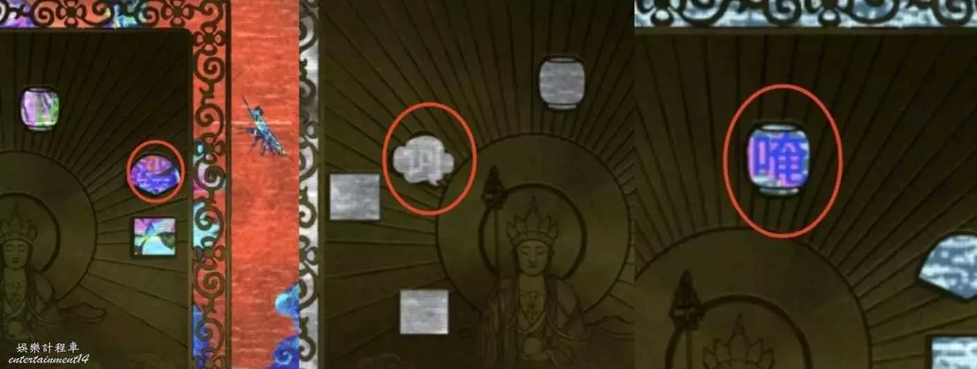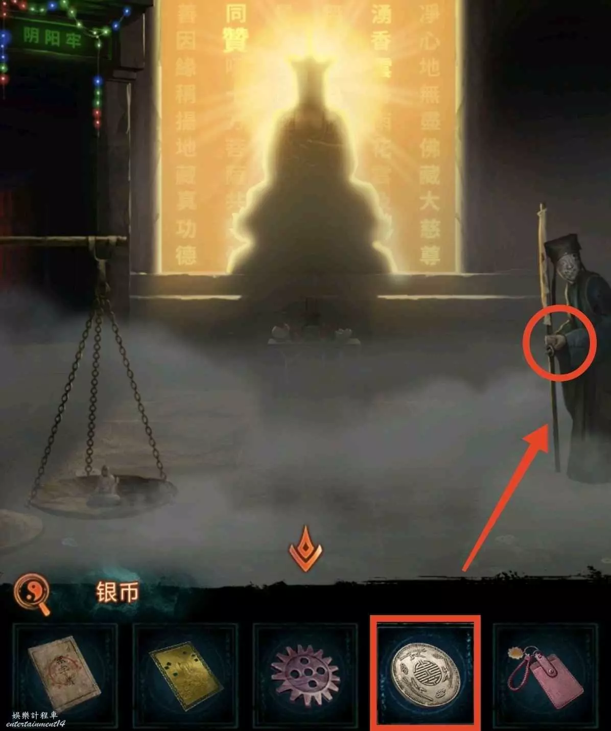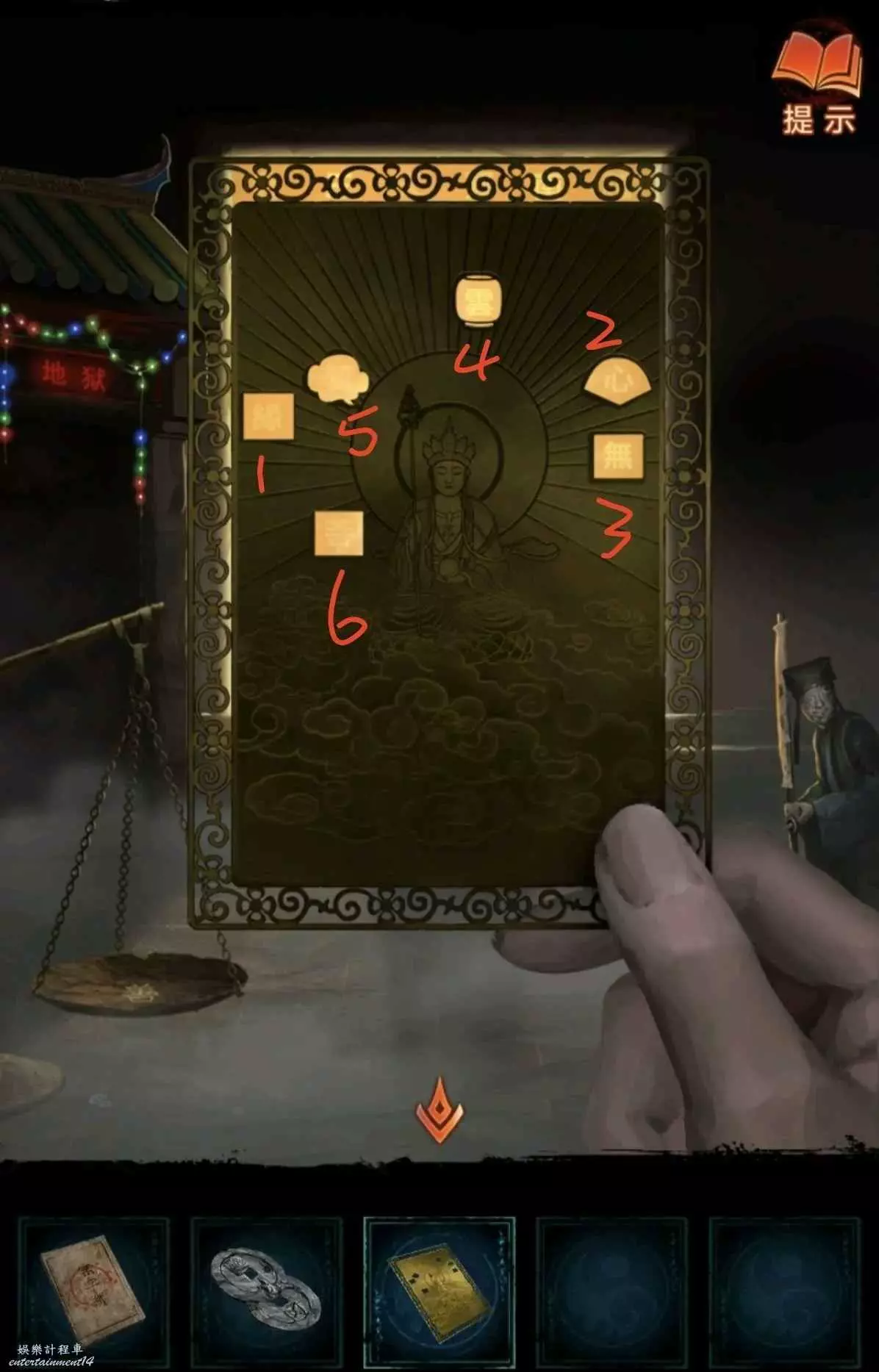 2、進門先看答題卡,得知線索7,順序已在圖中標識,然後去中間供奉台如圖把燈熄滅(謎底在書裡一二句),獲得齒輪和雕像,把雕像放到左邊稱上可開門。