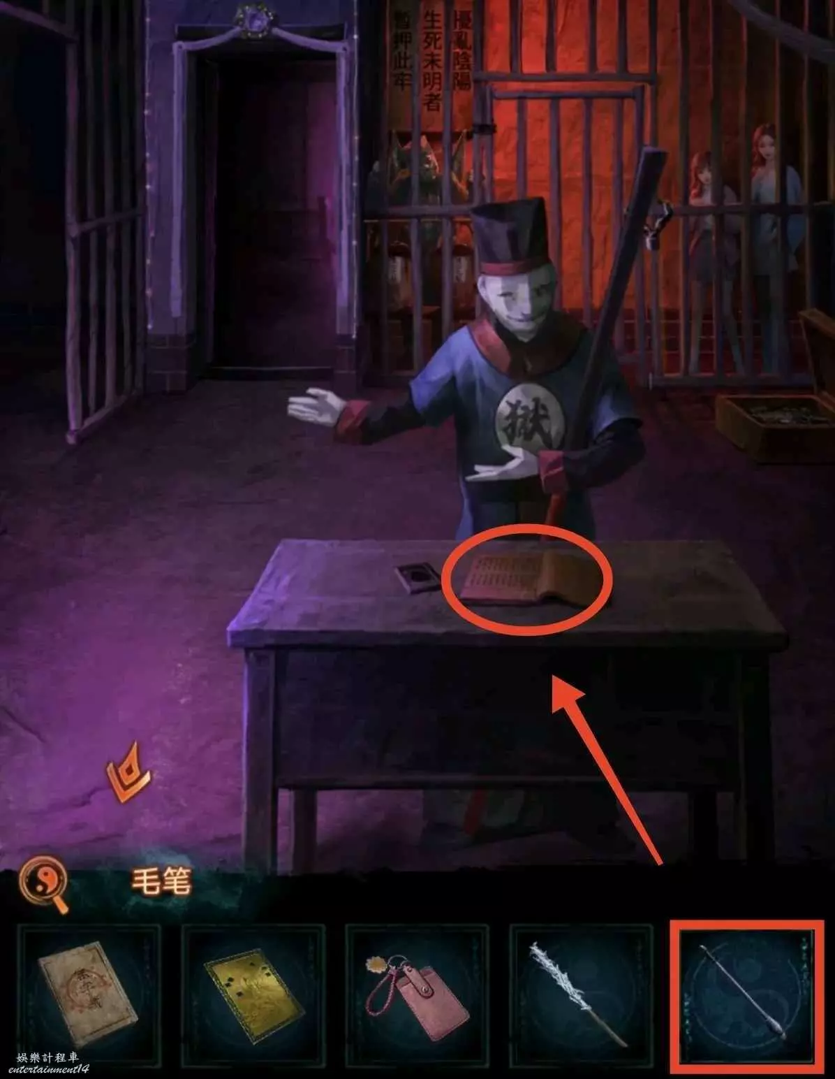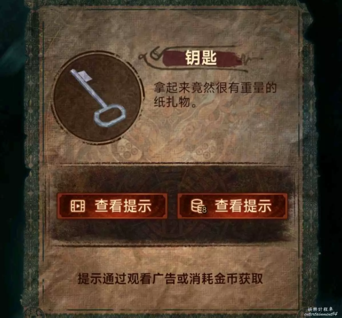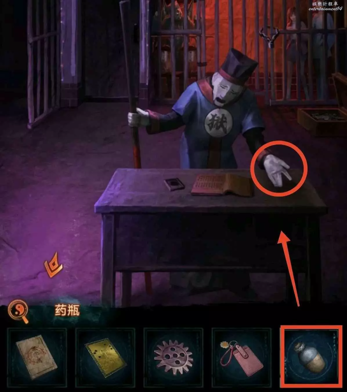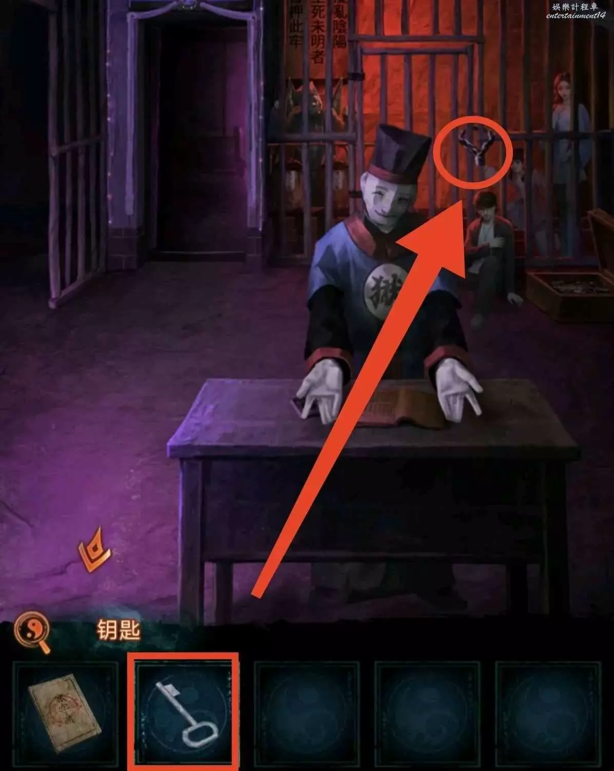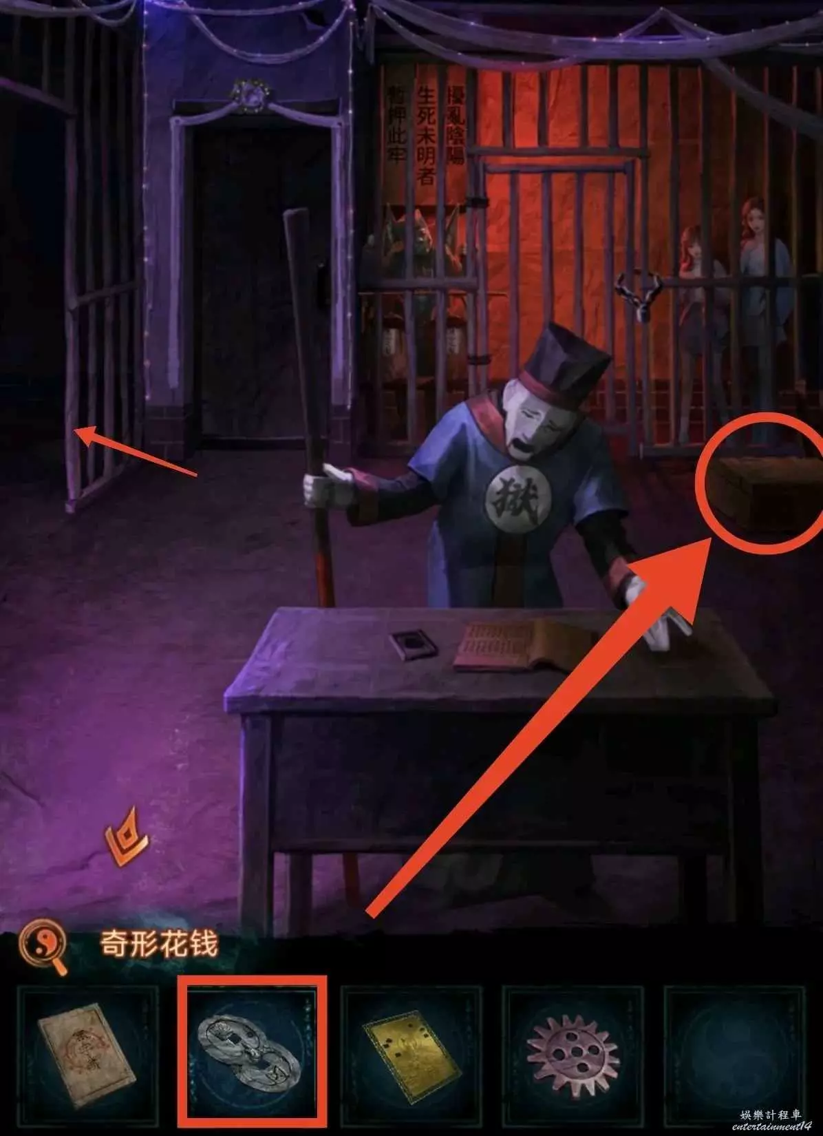 3、進牢房先用花錢開箱子,獲得銀幣和鑰匙卡,然後往左邊牢房瞥一眼獲得線索8;銀幣給大殿的老八,獲得藥瓶;藥瓶給獄警開劇場門。