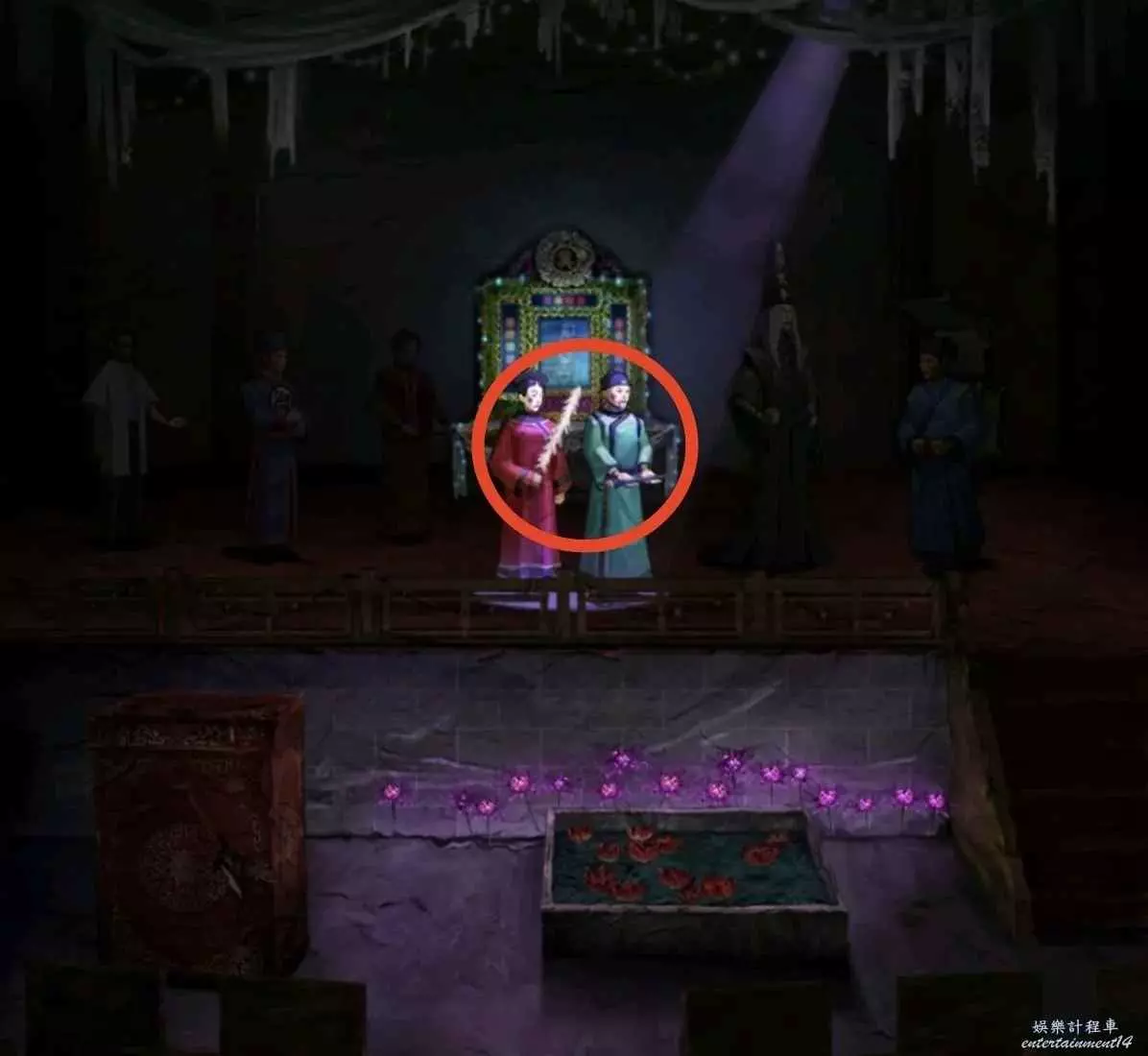 4、齒輪放上左邊箱子,玩個簡單小遊戲如圖所示,開啟劇場,從劇場演員上獲得哭喪棒和毛筆。小花壇根據線索7依次點擊獲得木魚棒。