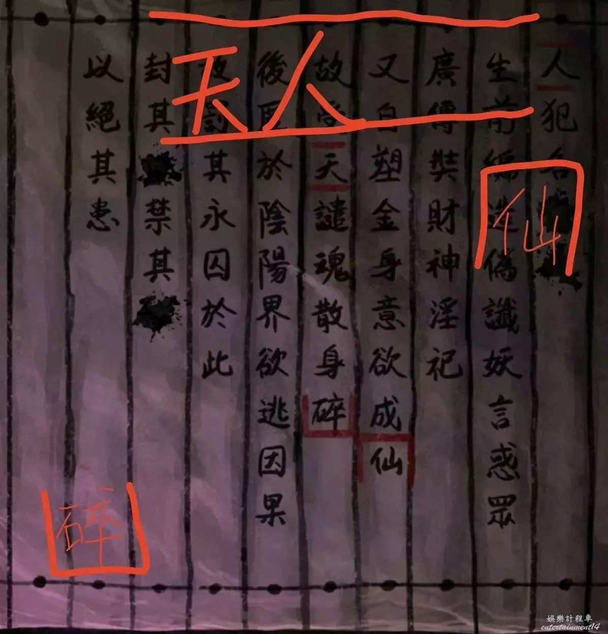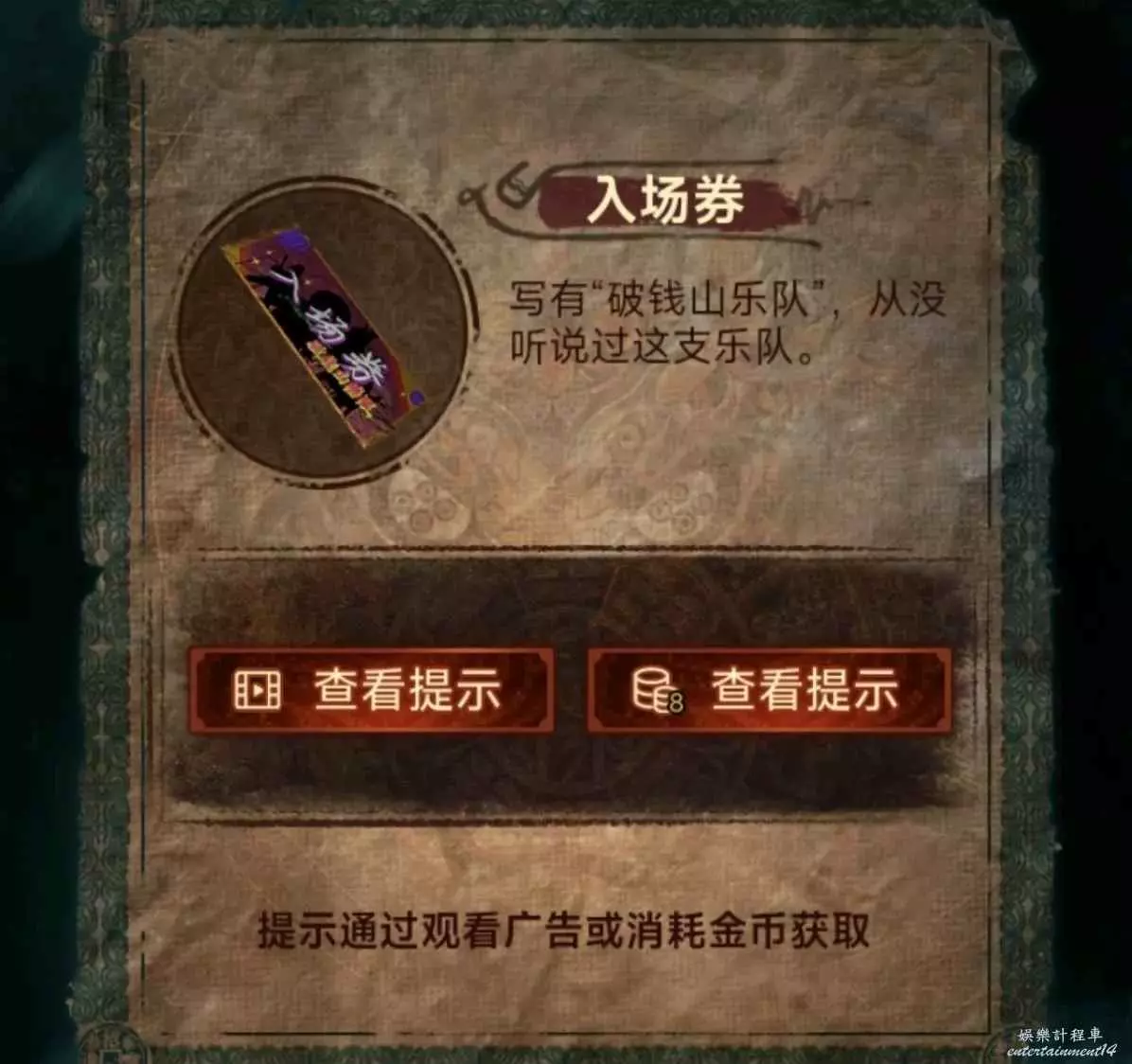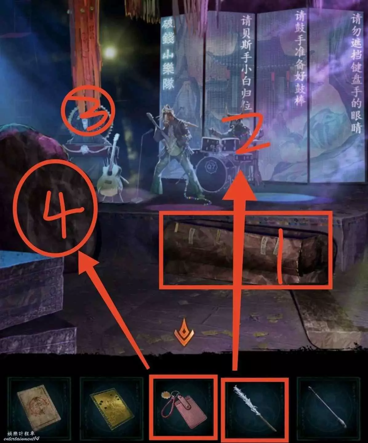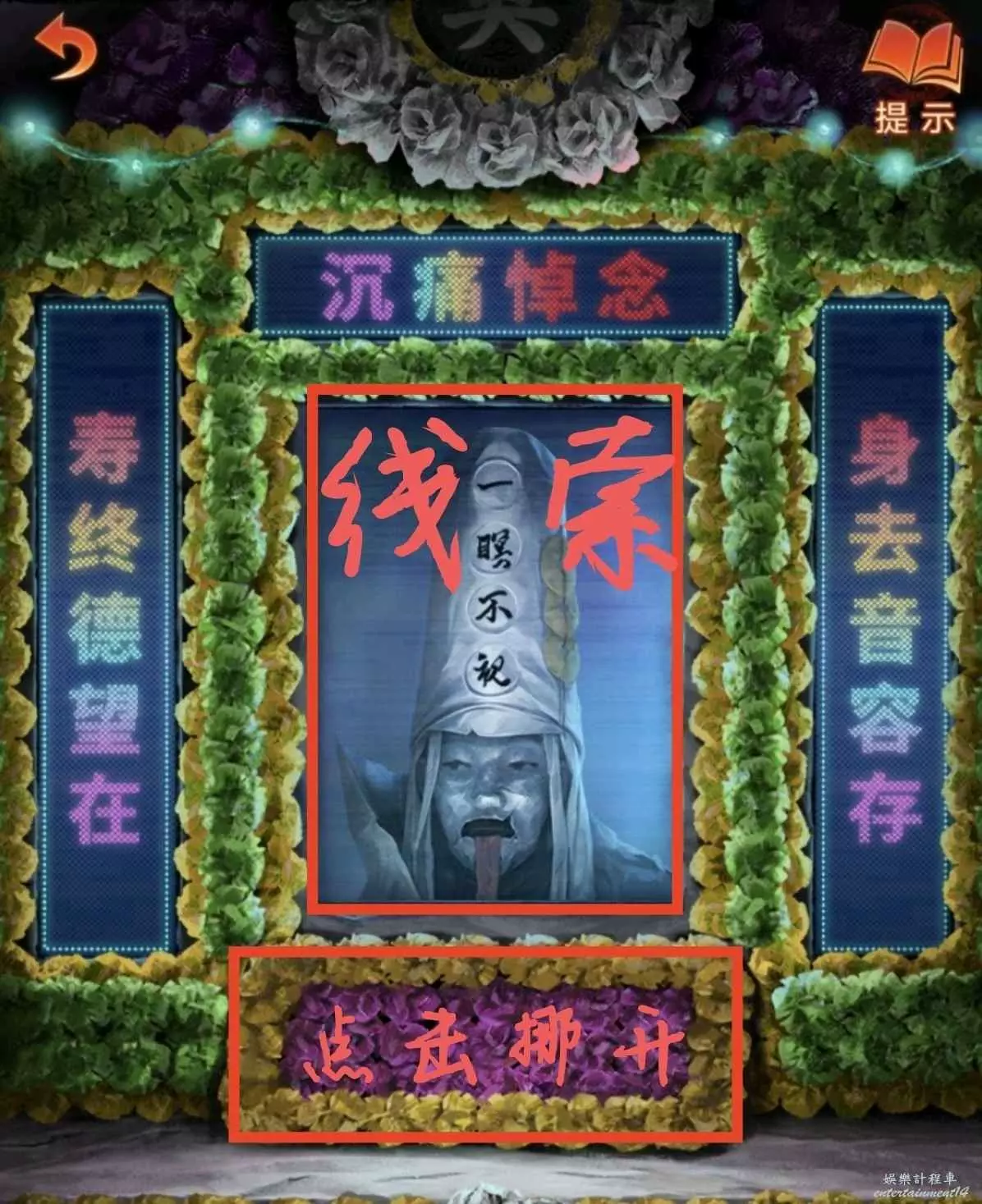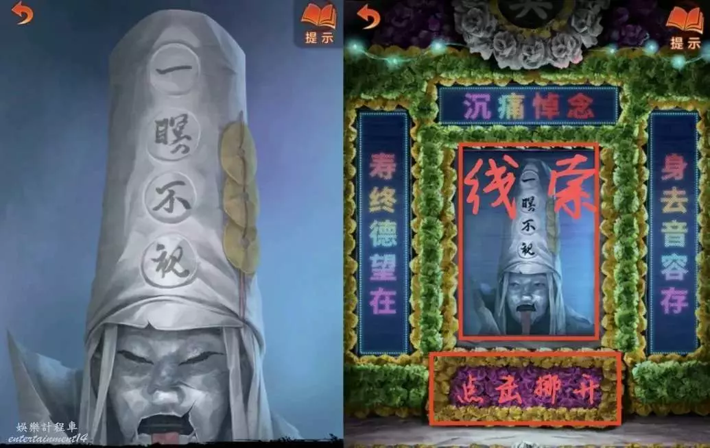 6、門票給倒掛人,進livehouse先搜棺材,獲得算盤和唱片,然後把哭喪棒和木魚棒給鼓手,然後去黑無常那裡拿紙錢,注意看帽子上的字獲得線索10,最後去最左邊石頭用門禁卡刷開點歌機,密碼是線索10(謎底怎麼來的?帽子上六個四字詞,從上往下從右往左填就知道了,只需注意第二個字和第三個字的位置變換即可。)