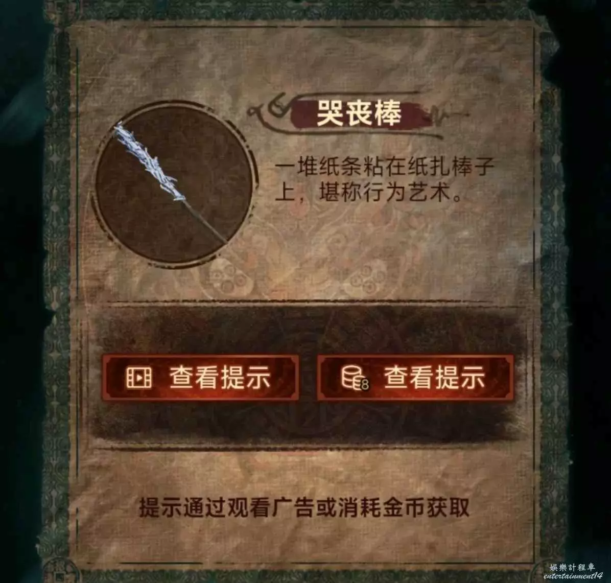 8、紙幣給獄警獲得水火棍,進劇場把演員需要的道具補上,出現線索13;回livehouse的機子,點擊線索13相關圖片確認自己不是人機後,獲得紙人頭髮,出門遇到老騙子,與他鬥智鬥勇後獲得他的帽子。