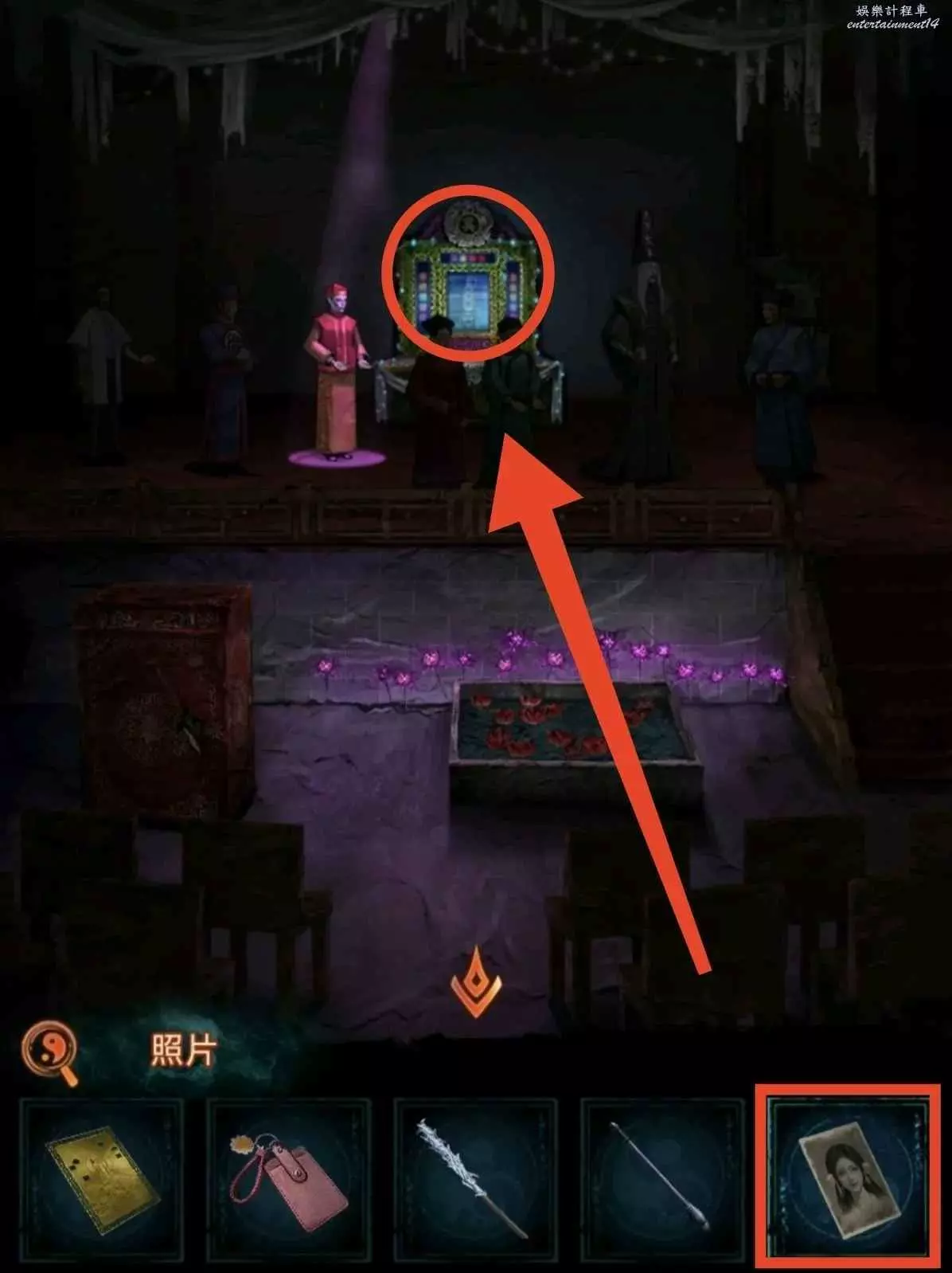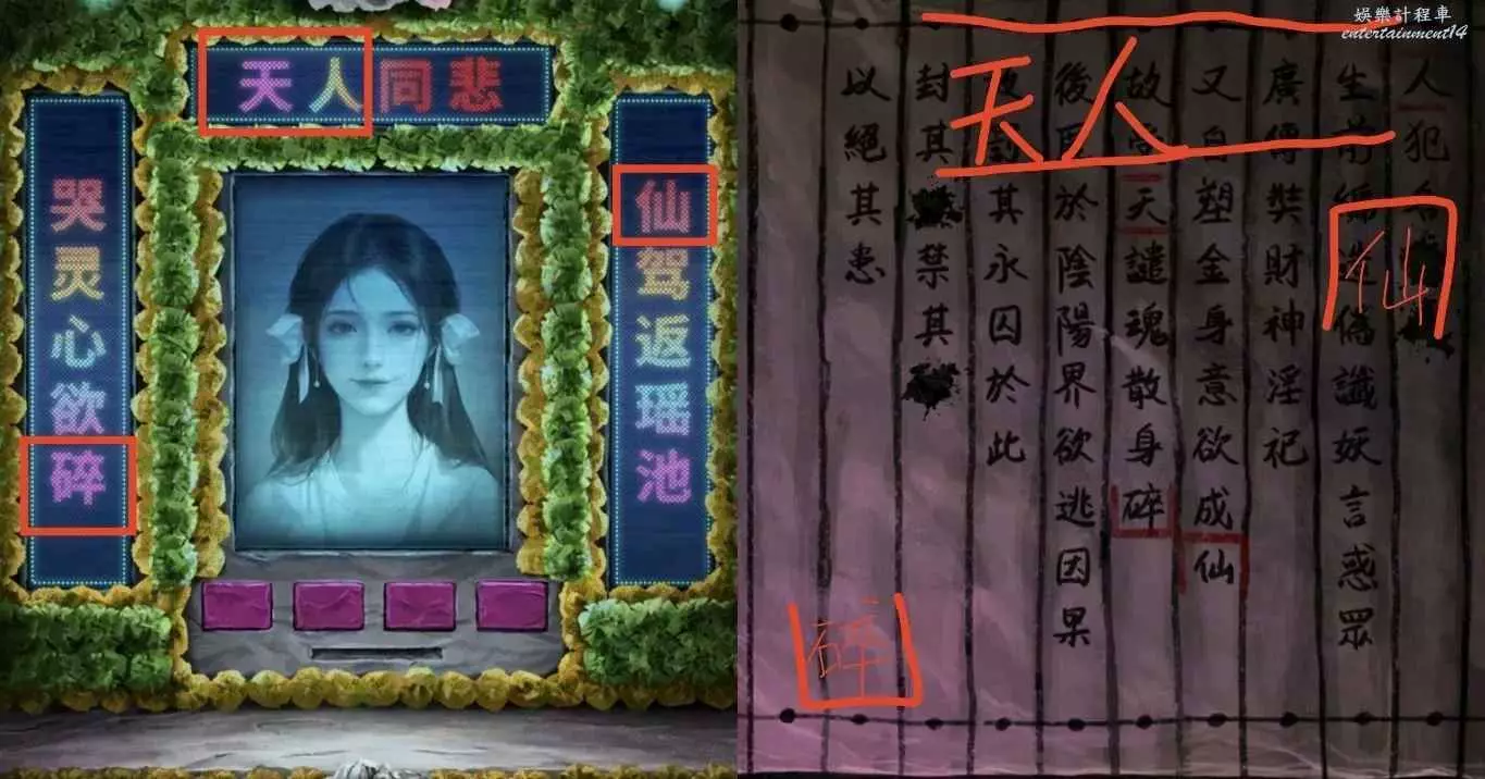 5、去案桌上寫上男女雙方高姓大名,獲得女主照片;去劇場祭奠台把下方擋板扔掉,把女主照片塞進去,通過按鈕找出線索8有出現的字(如圖),獲得LiveHouse入場券。PS:祭奠台的白無常是線索9
