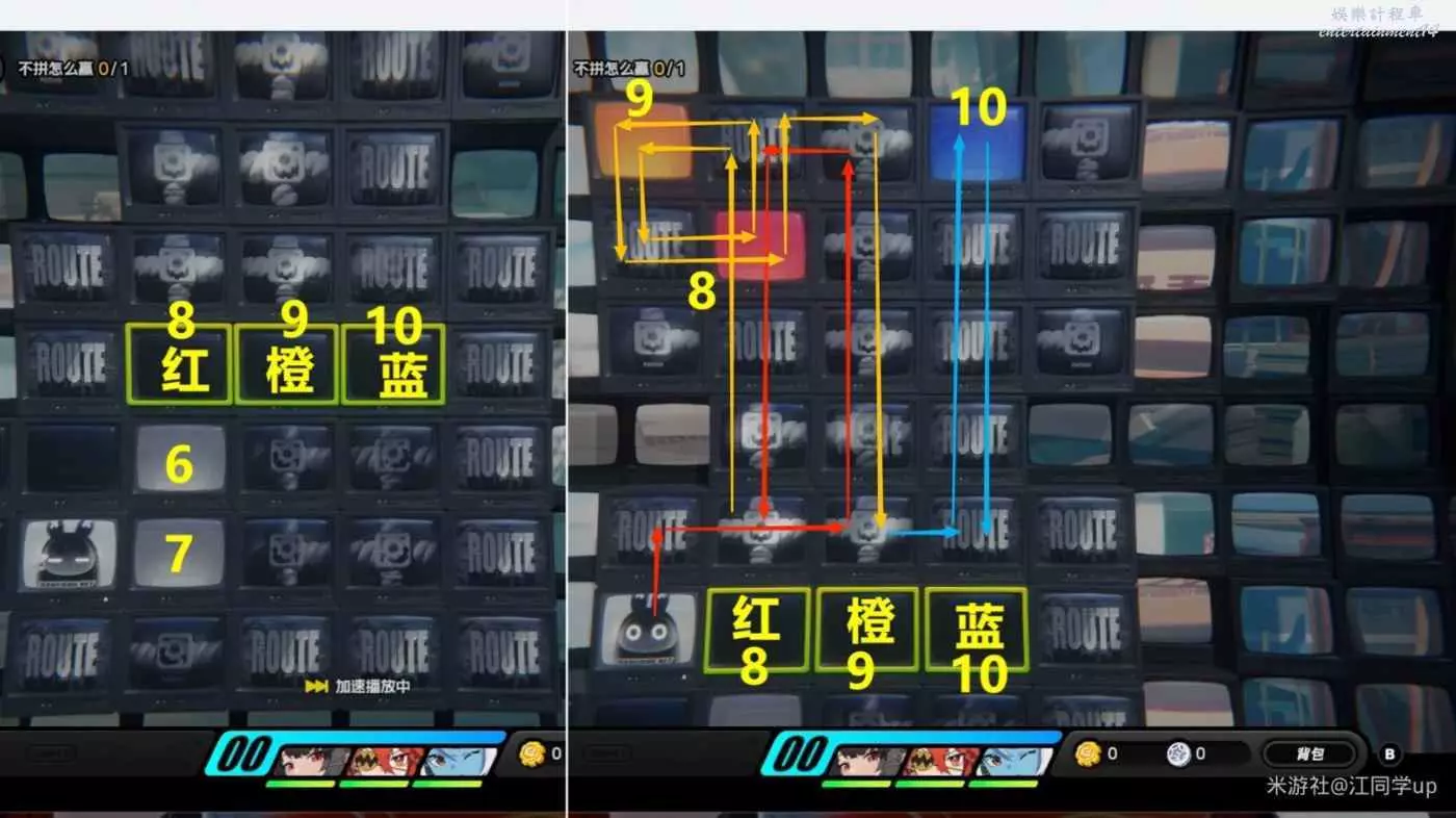 (6)接著依次按照我下圖藍-橙-紅路線順序,將右邊對應顏色的方塊依次推到左邊對應顏色區域後,即可完成該次解密