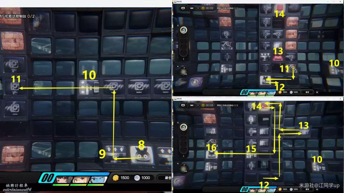 (2)接著去左邊9-10-11區域,在11區域放一個炸彈後走到下面12區域引爆11區域炸彈,炸掉13區域過來的怪後,再去上面拿了13區域寶箱,接著去14區域將15區域彈簧方向變為向左後,從15區域去16區域